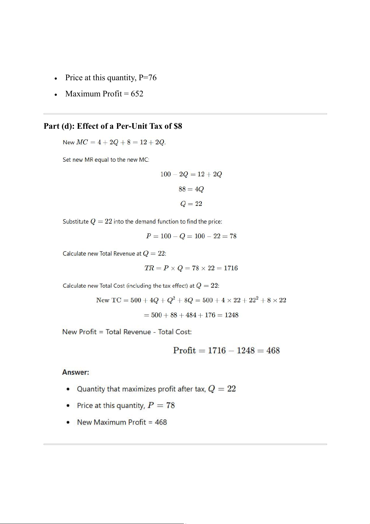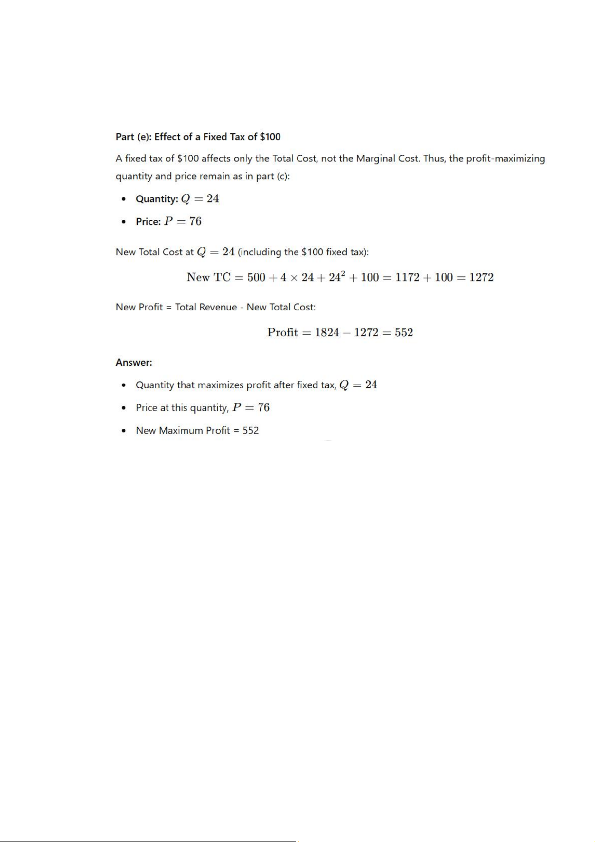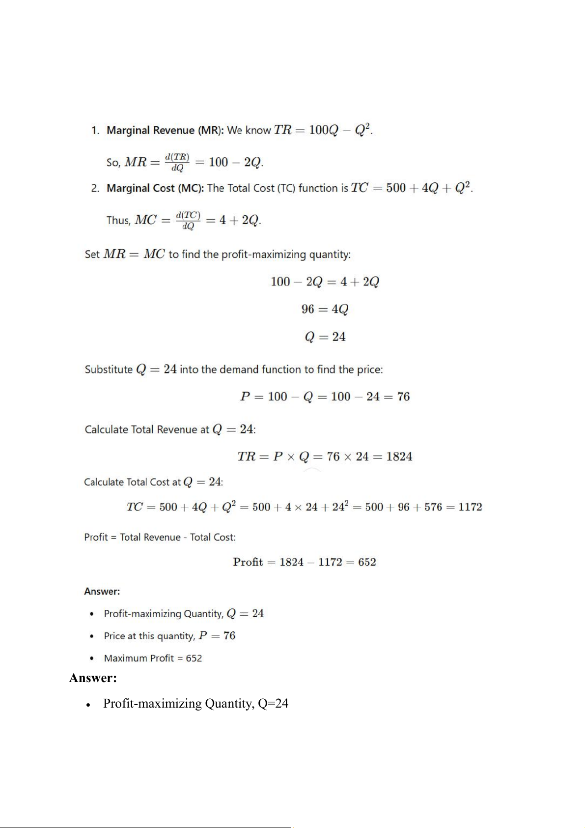 Profit-maximizing Quantity, Q=24 Price at this quantity, P=76 Maximum Profit = 652