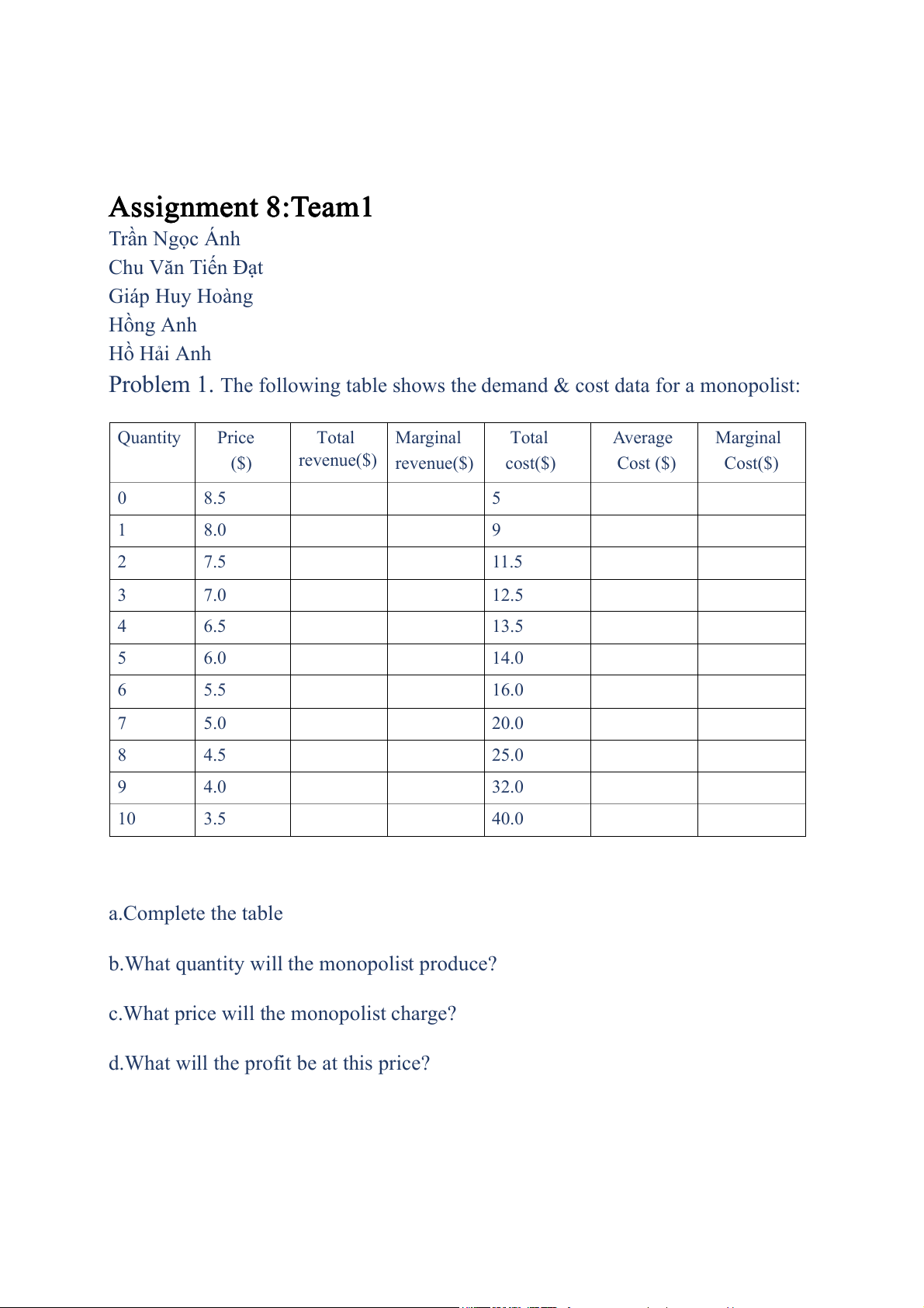 Problem 1. The following table shows the demand & cost data for a monopolist: Quantity Pric e Total Marginal Total Average Marginal ($) revenue($) revenue($) cost($ ) Cost ($) Cost($) 0 8.5 5 1 8.0 9 2 7.5 11.5 3 7.0 12.5 4 6.5 13.5 5 6.0 14.0 6 5.5 16.0 7 5.0 20.0 8 4.5 25.0 9 4.0 32.0 10 3.5 40.0 a.Complete the table