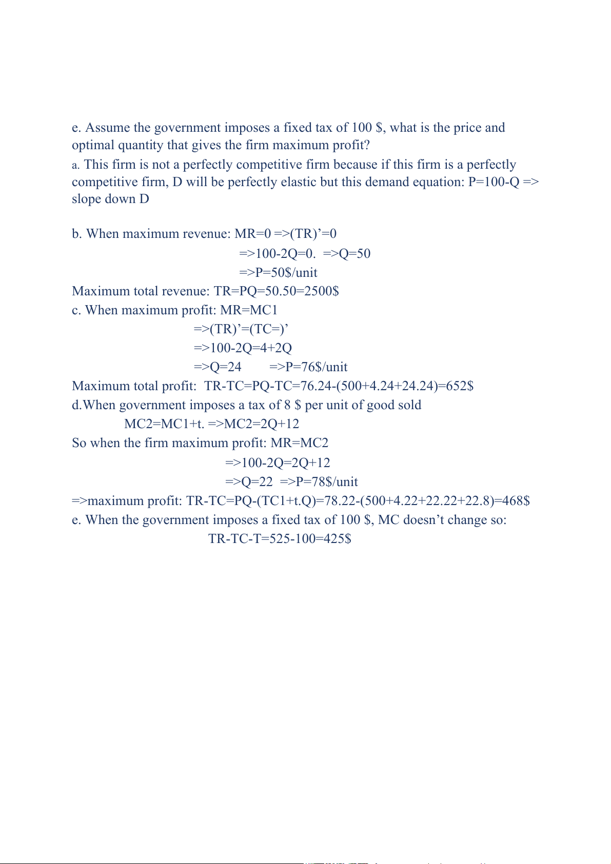 =>maximum profit: TR-TC=PQ-(TC1+t.Q)=78.22-(500+4.22+22.22+22.8)=468$
