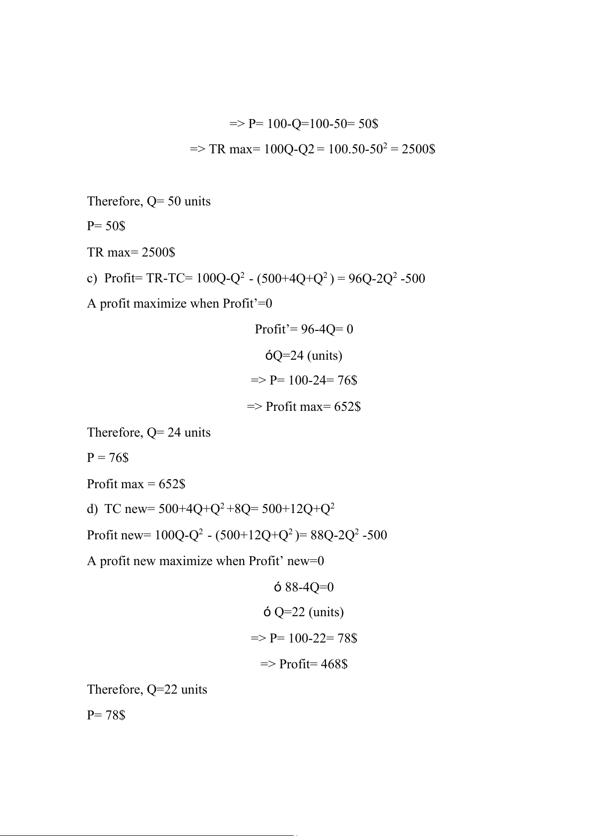A profit new maximize when Profit’ new=0 ó 88-4Q=0 ó Q=22 (units) => P= 100-22= 78$ => Profit= 468$ Therefore, Q=22 units P= 78$ Profit = 468$