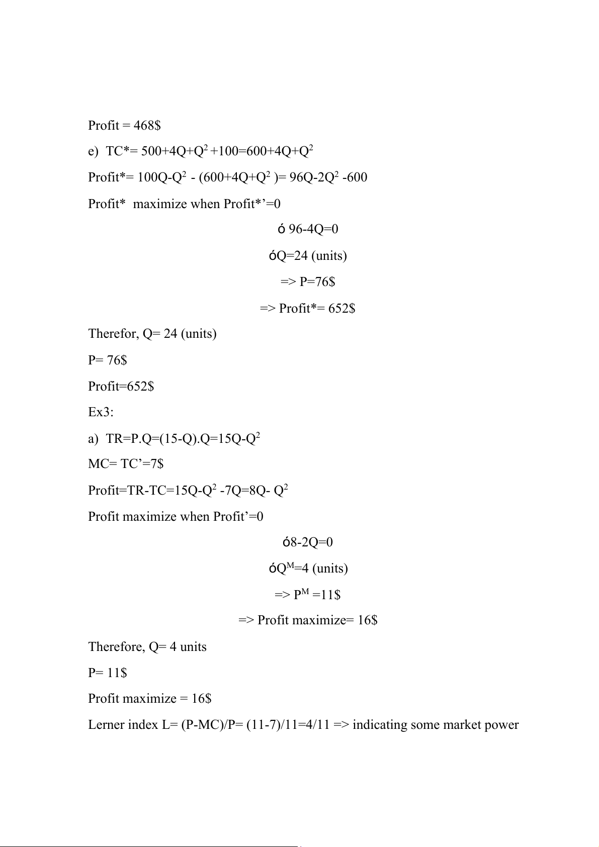 Profit* maximize when Profit*’=0 ó 96-4Q=0 óQ=24 (units) => P=76$ => Profit*= 652$ Therefor, Q= 24 (units) P= 76$ Profit=652$ Ex3: a) TR=P.Q=(15-Q).Q=15Q-Q2 MC= TC’=7$ Profit=TR-TC=15Q-Q2 -7Q=8Q- Q2