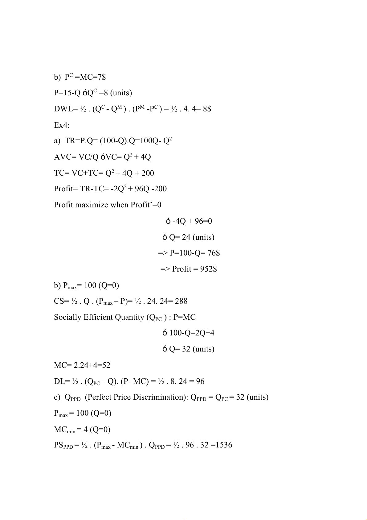 DWL= ½ . (QC - QM ) . (PM -PC ) = ½ . 4. 4= 8$ Ex4: a) TR=P.Q= (100-Q).Q=100Q- Q2 AVC= VC/Q óVC= Q2 + 4Q TC= VC+TC= Q2 + 4Q + 200 Profit= TR-TC= -2Q2 + 96Q -200