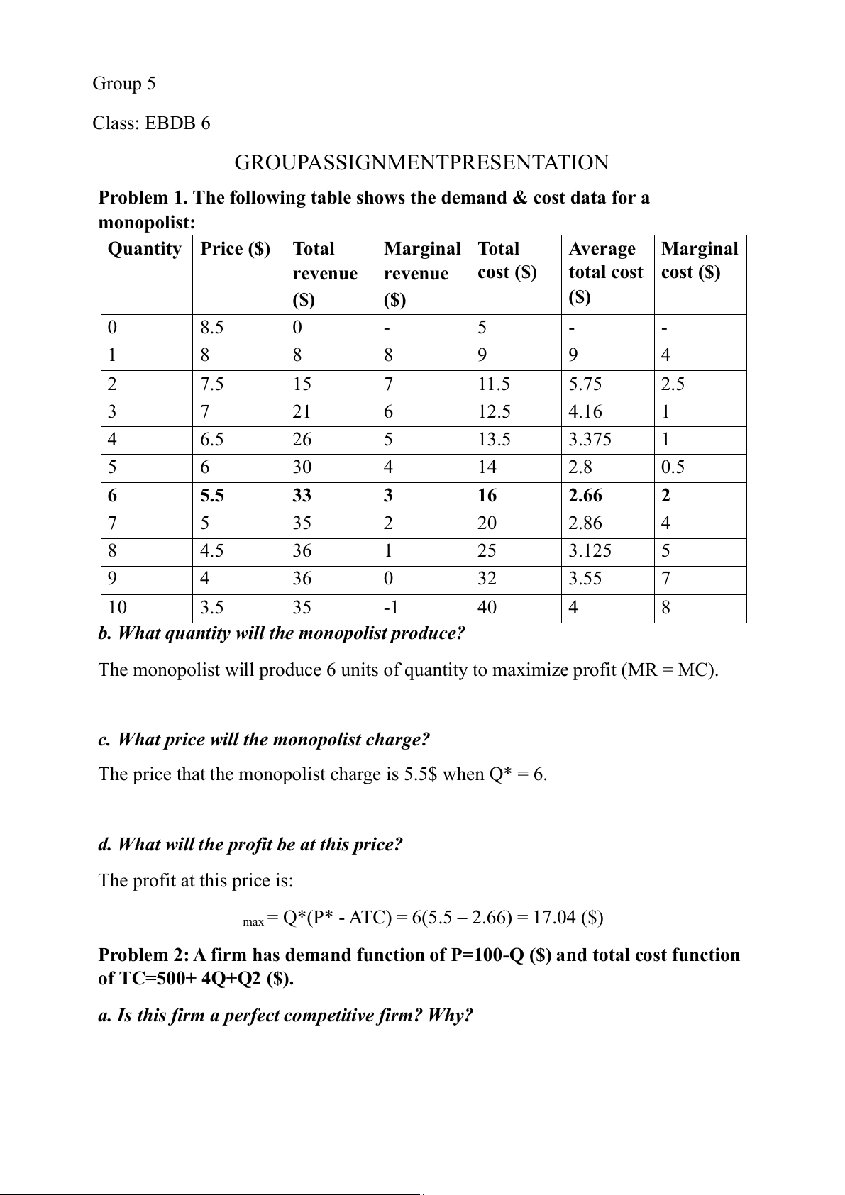 → max= Q(P – ATC) = 24(76 – 48.83) = 652.08 ($)