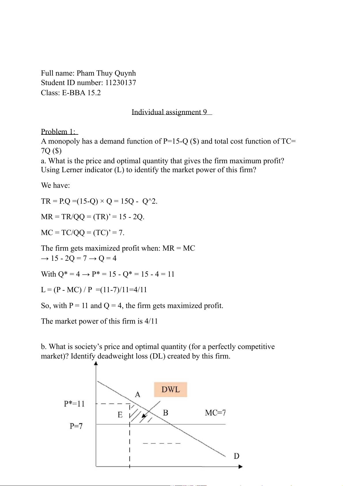 Full name: Pham Thuy Quynh Student ID number: 11230137 Class: E-BBA 15.2 Individual assignment 9 Problem 1: