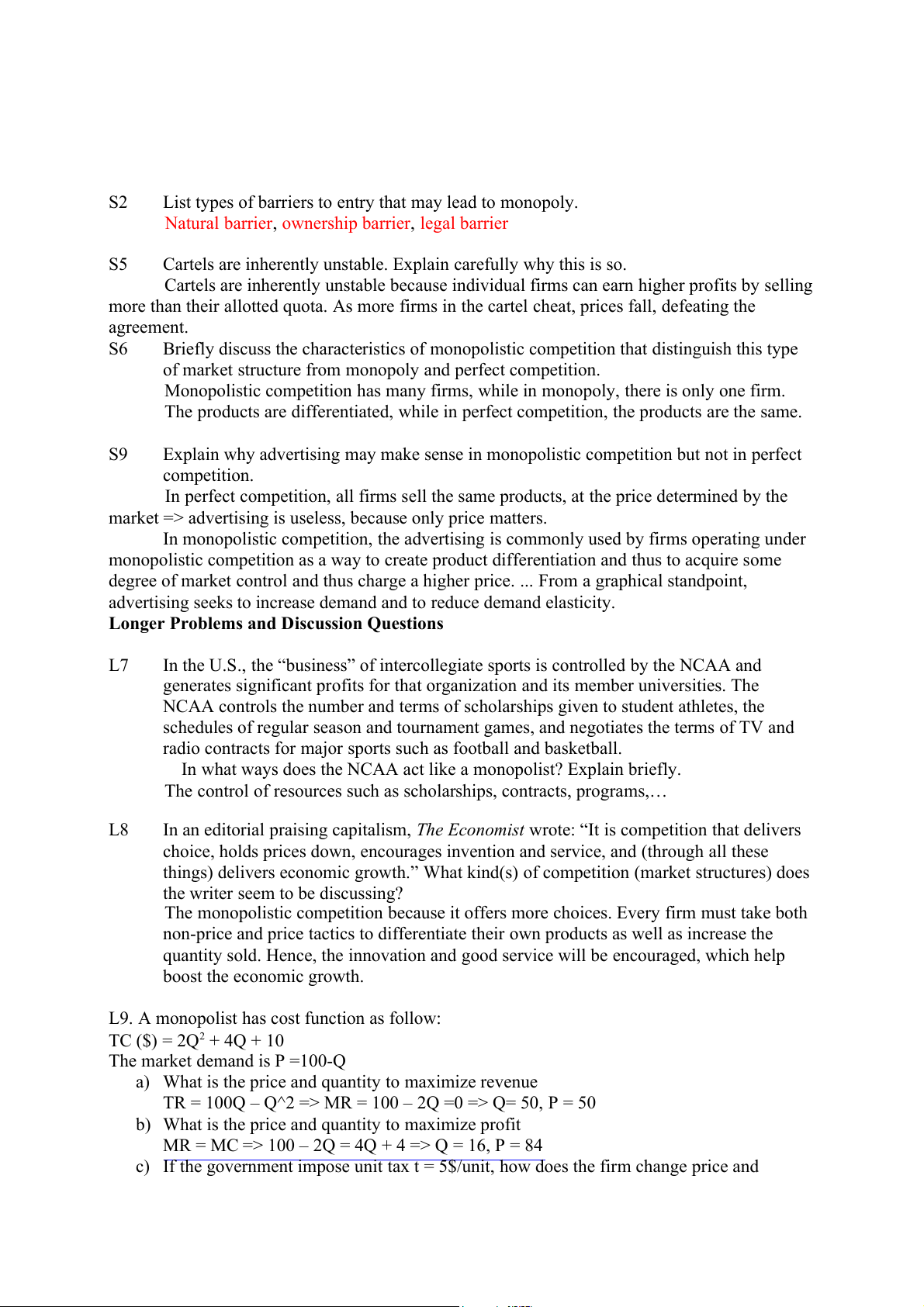 L9. A monopolist has cost function as follow: TC ($) = 2Q2 + 4Q + 10 The market demand is P =100-Q