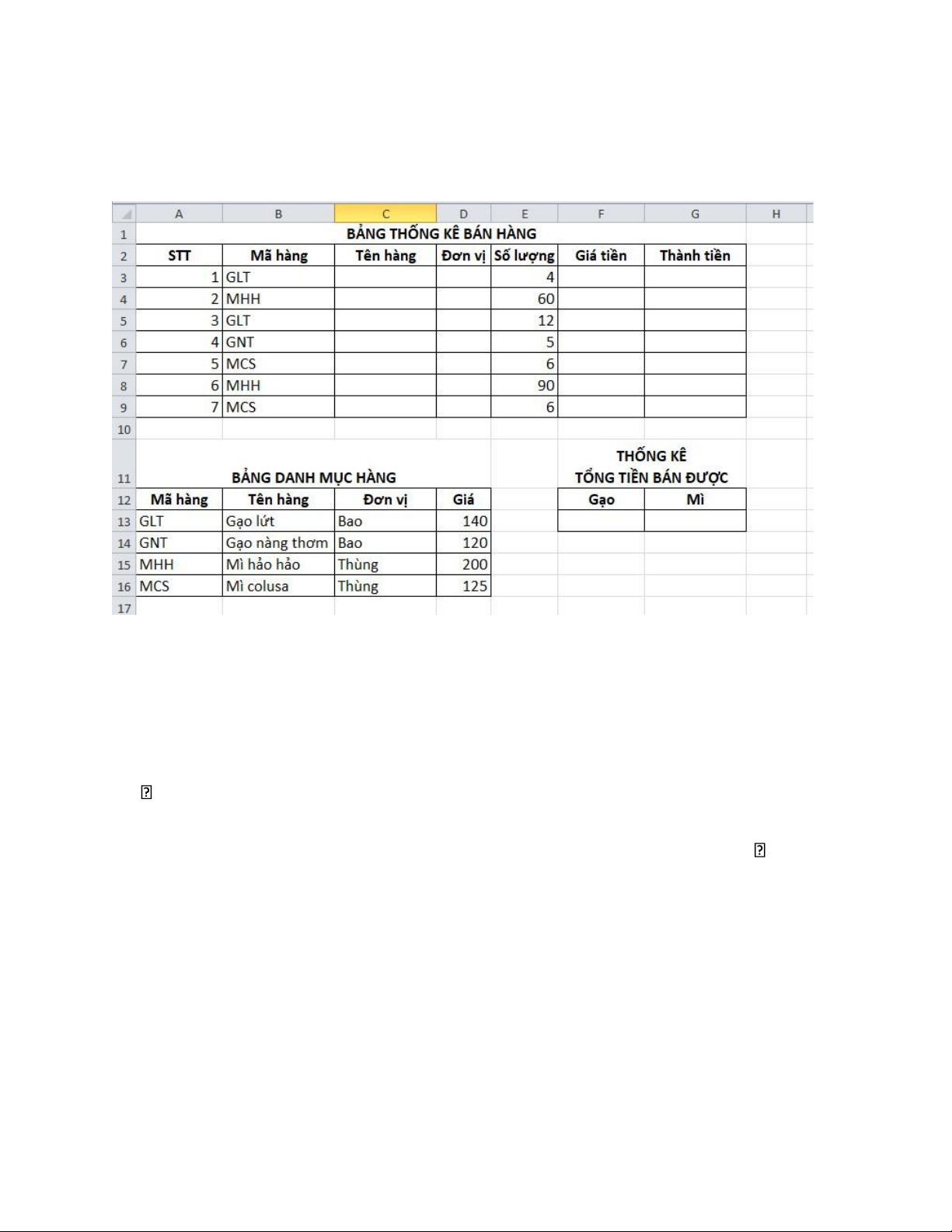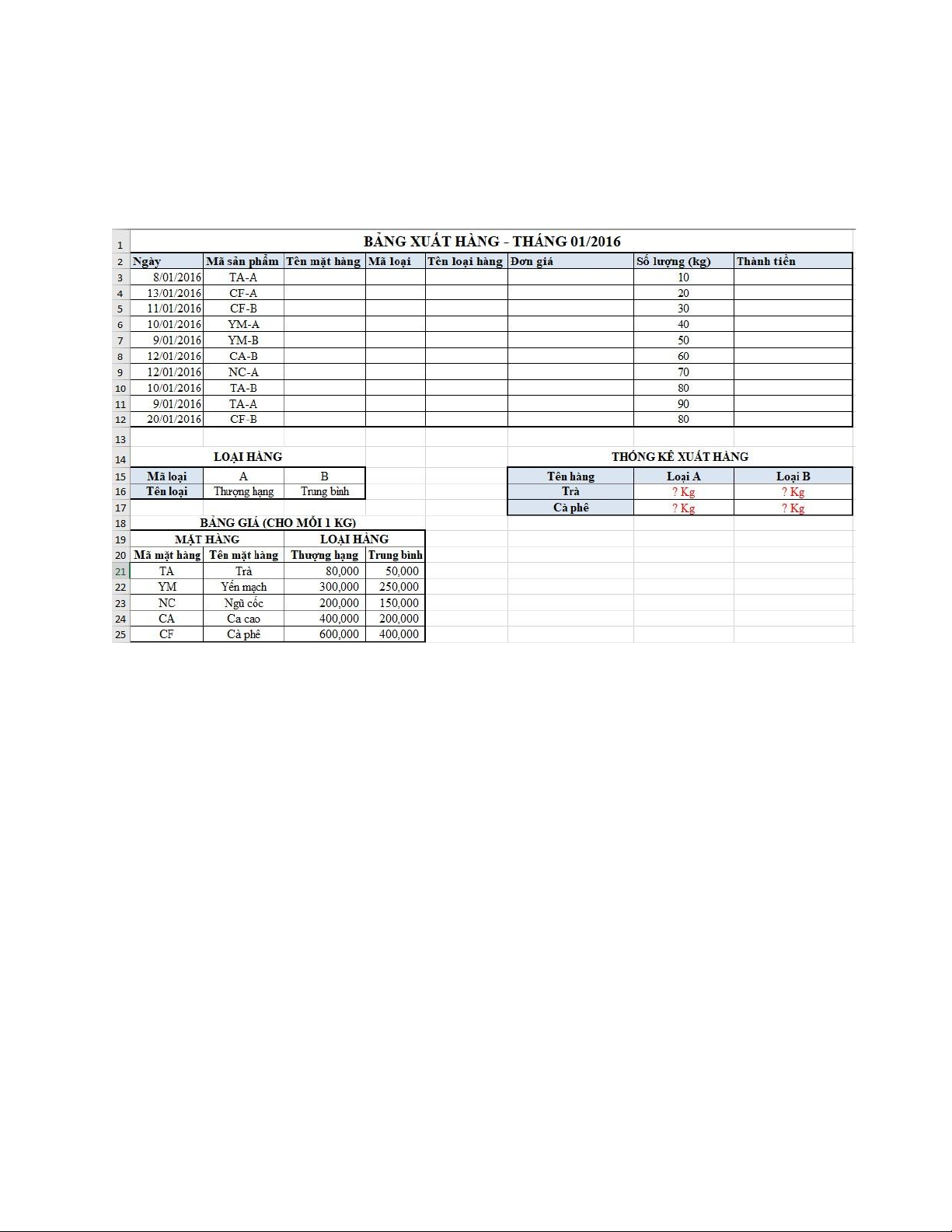 • Tên mặt hàng dựa vào 2 ký tự đầu của Mã sản phẩm và bảng BẢNG GIÁ.