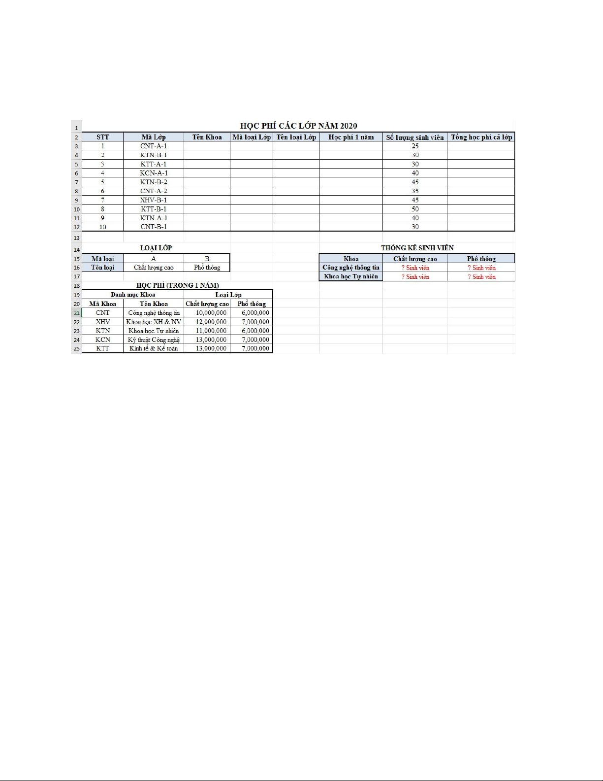 • Tên Khoa dựa vào 3 ký tự đầu của Mã Lớp và bảng HỌC PHÍ.