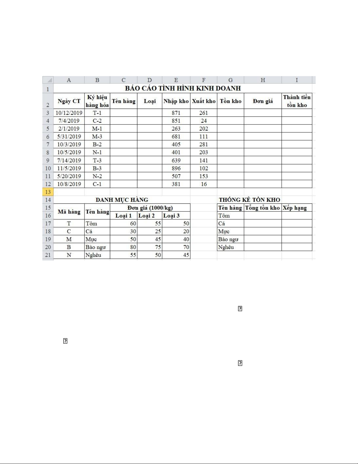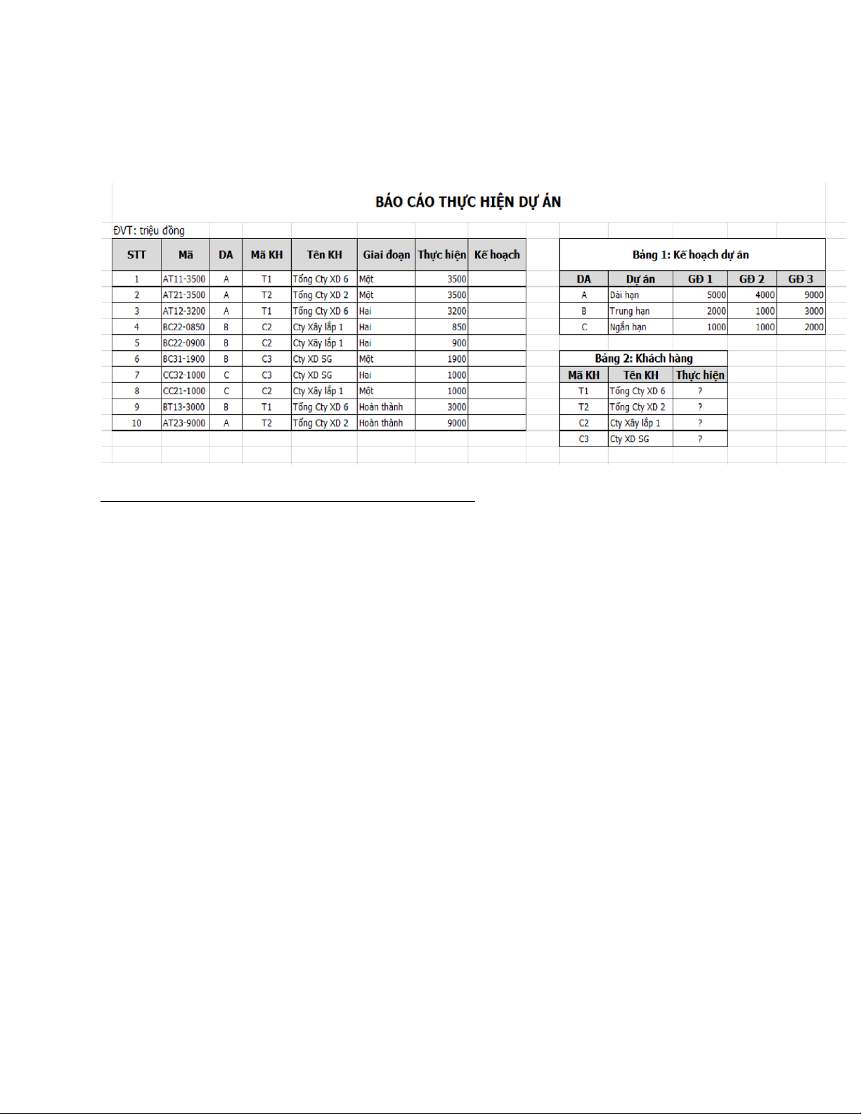 hàng rồi điền vào cột Thực hiện của Bảng 2 (1điểm).