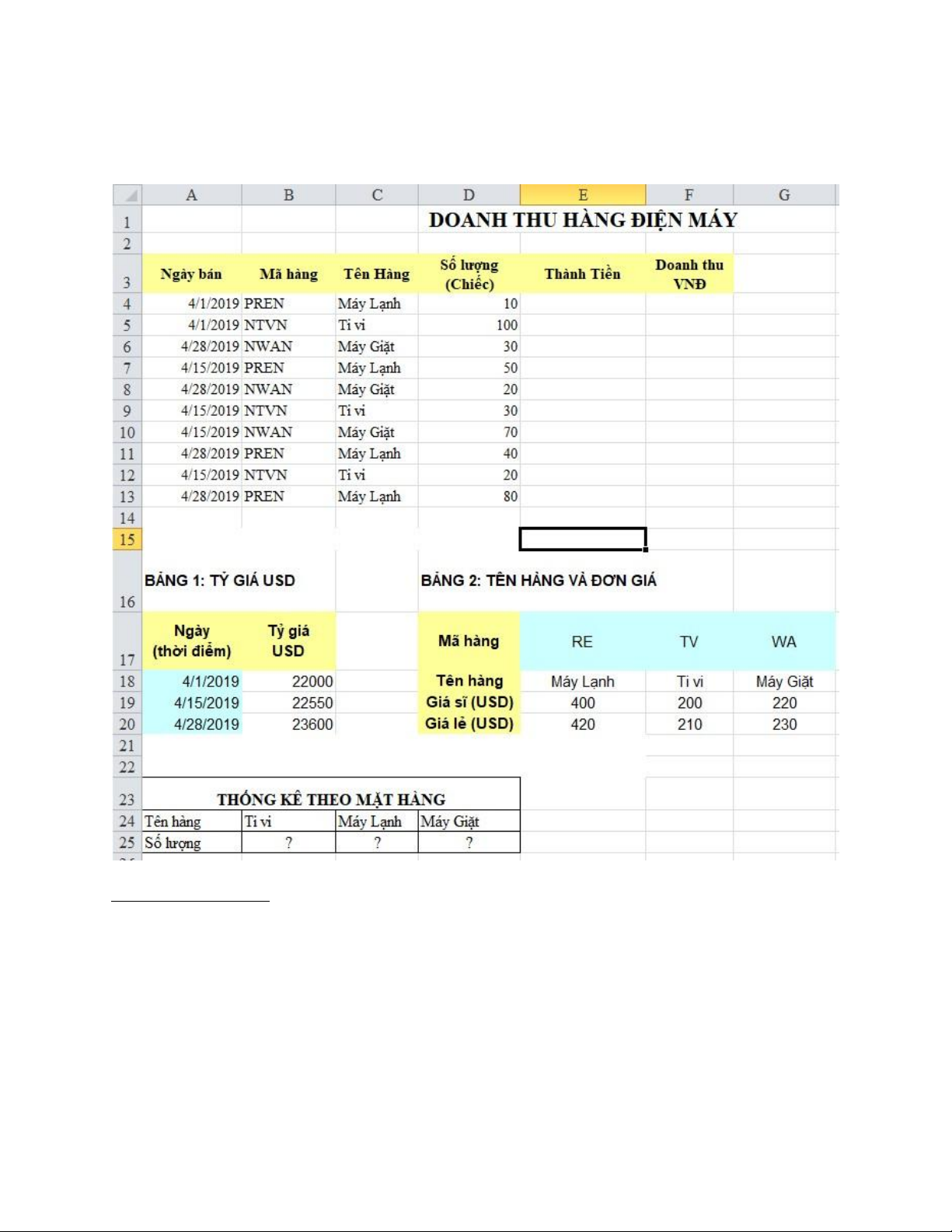 Cho bảng dữ liệu trong MS Excel như sau: Yêu cầu thực hiện: 1.