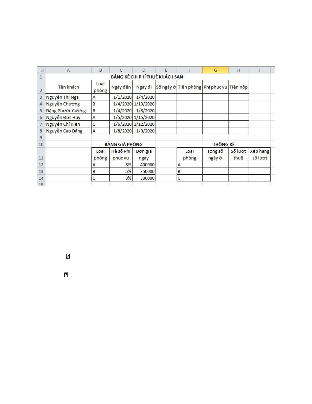 a) Điền thông tin cột Số ngày ở và Tiền phòng (1 điểm), biết: