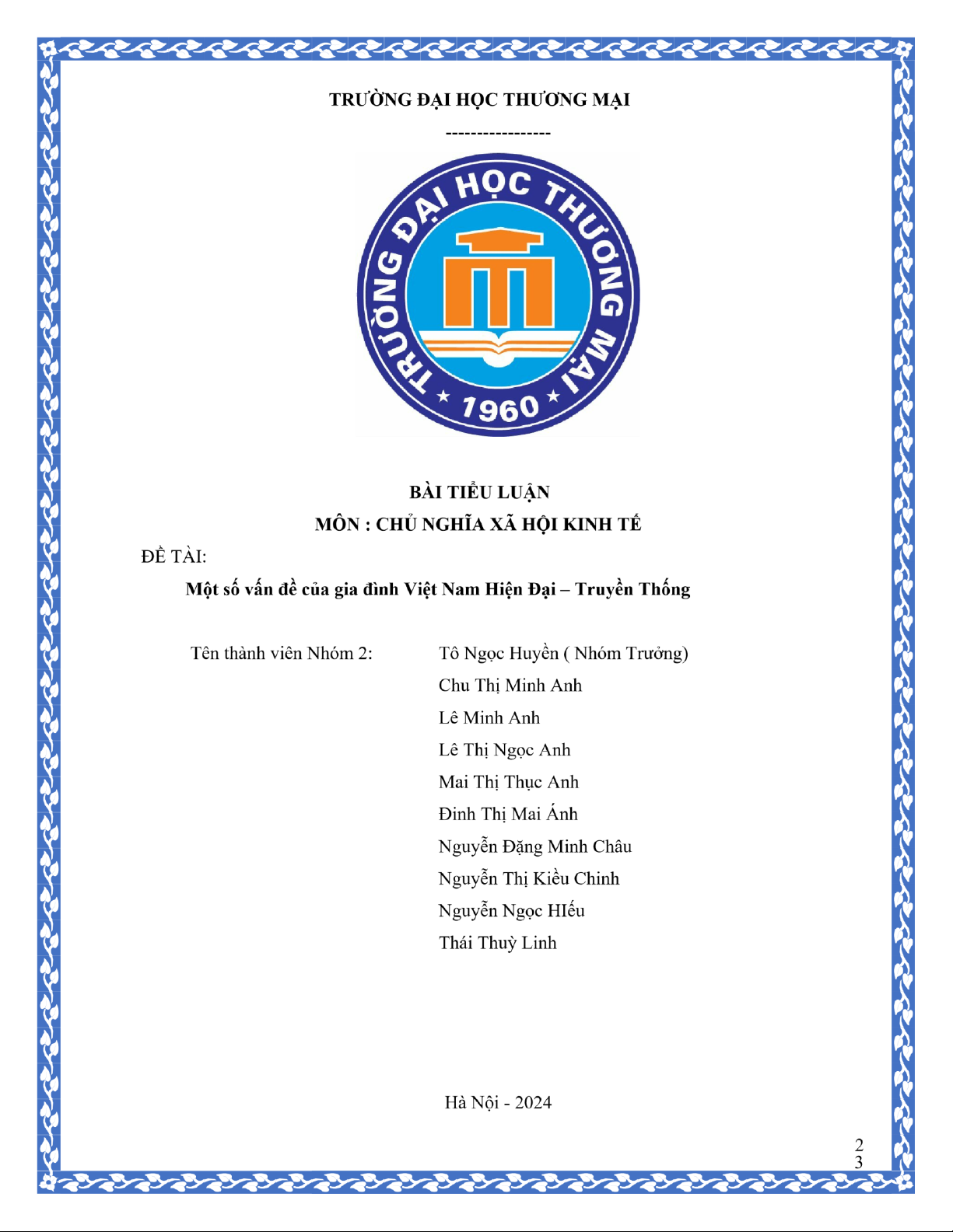 Một số vấn đề của gia đình Việt Nam Hiện Đại – Truyền Thống lOMoAR cPSD| 46342576 Nhóm thực hiện: Nhóm 2 Lớp học phần : K56DQ2 Giảng viên hướng dẫn: TS. Đặng Minh Tiến Hà Nội – 2024 lOMoAR cPSD| 46342576 3 lOMoAR cPSD| 46342576