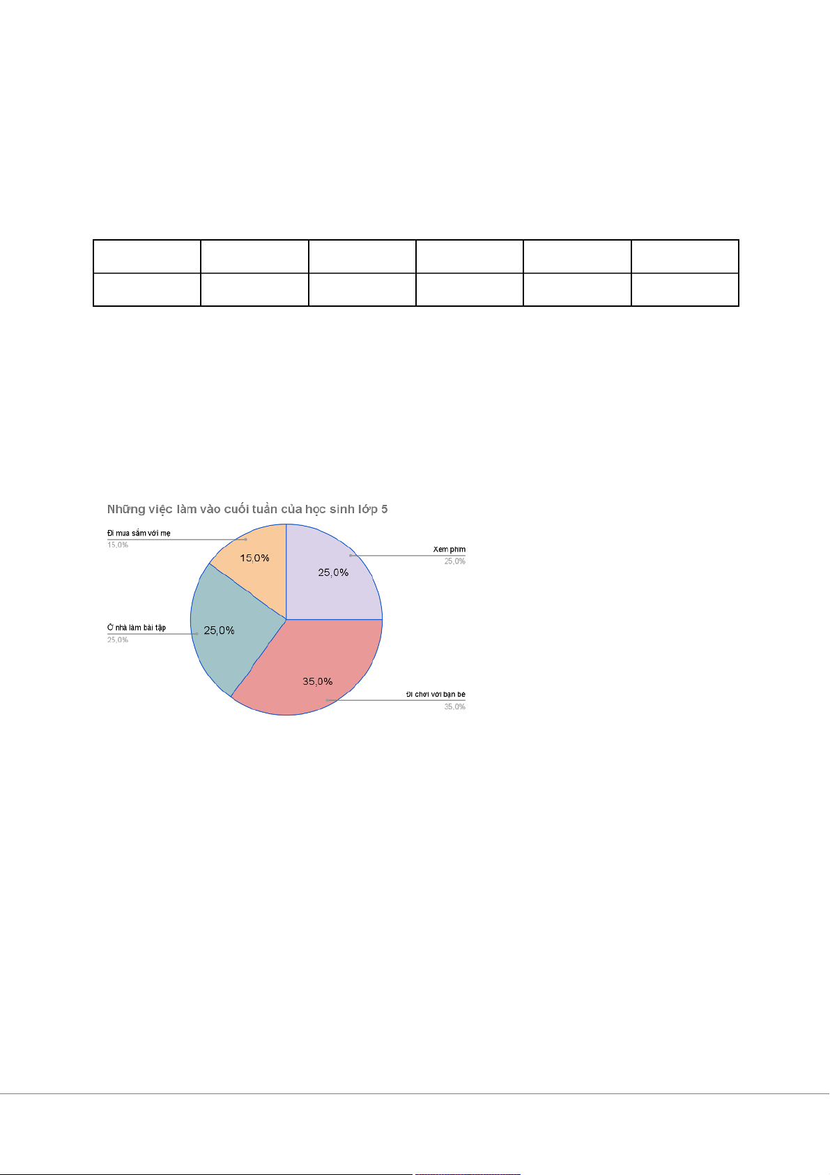 Ví dụ 2: Cho biểu đồ khảo sát 100 học sinh lớp 5 về thói quen mỗi cuối tuần, hãy nhìn kỹ biểu