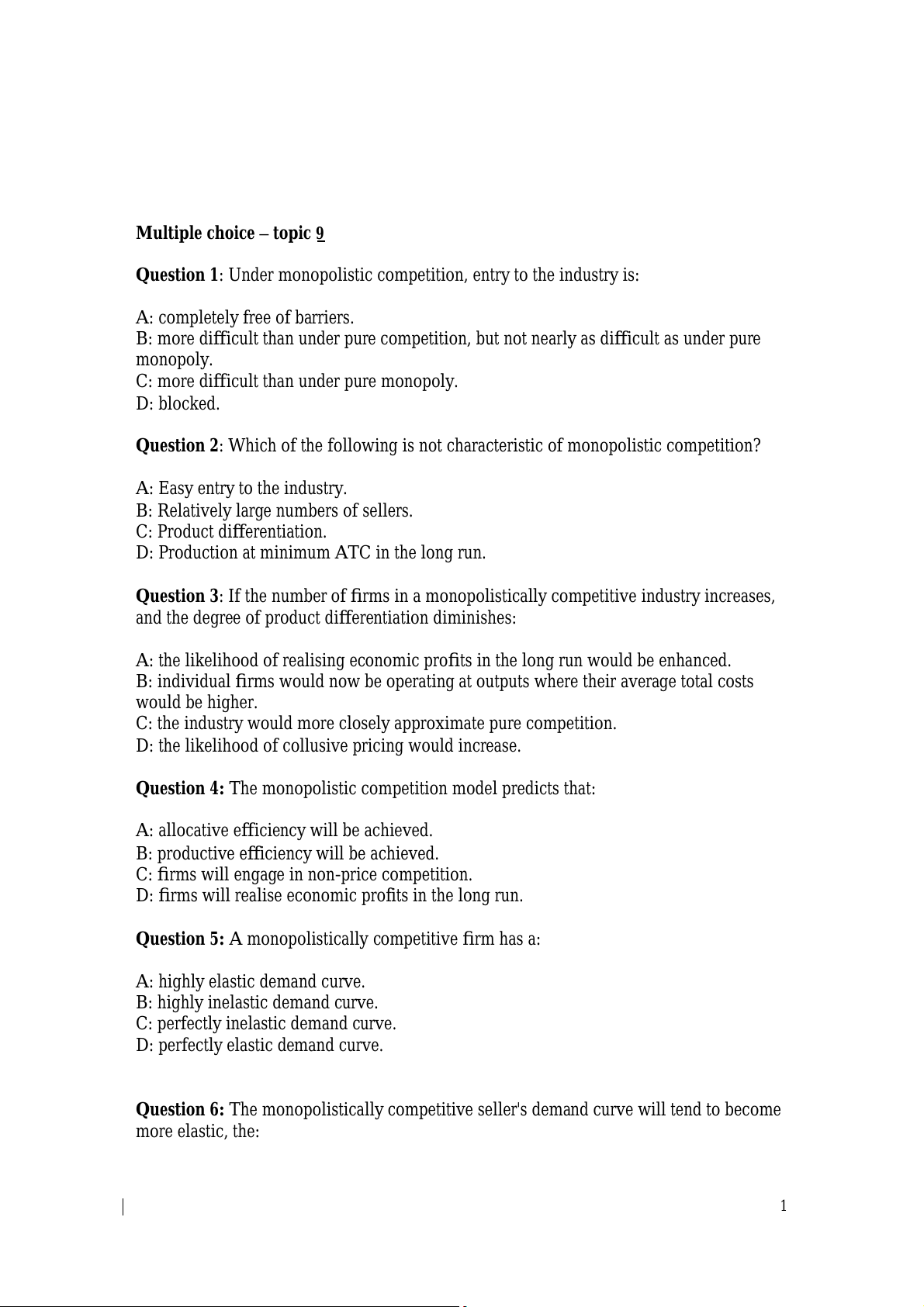 Question 1: Under monopolistic competition, entry to the industry is: