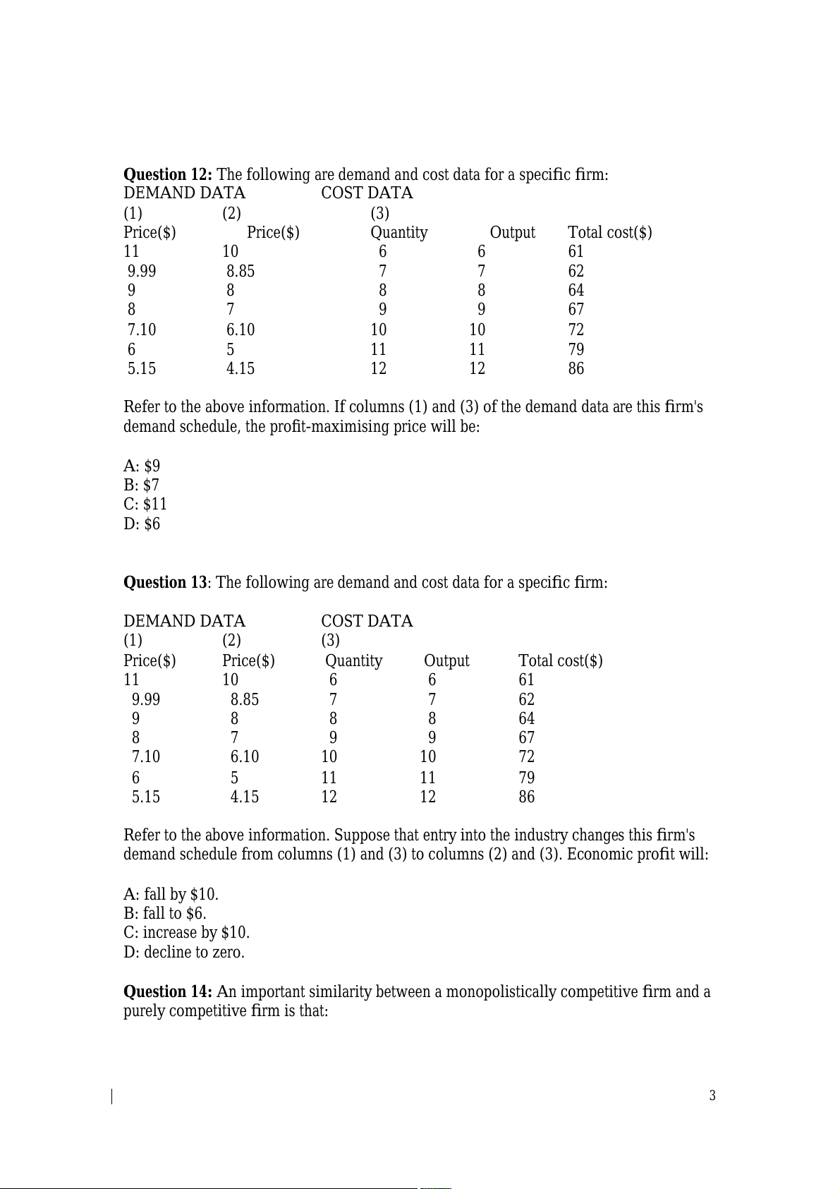 Question 13: The following are demand and cost data for a specific firm: DEMAND DATA COST DATA (1) (2) (3) Price($) Price($) Quantity Output Total cost($) 11 10 6 6 61 9.99 8.85 7 7 62 9 8 8 8 64 8 7 9 9 67 7.10 6.10 10 10 72 6 5 11 11 79 5.15 4.15 12 12 86