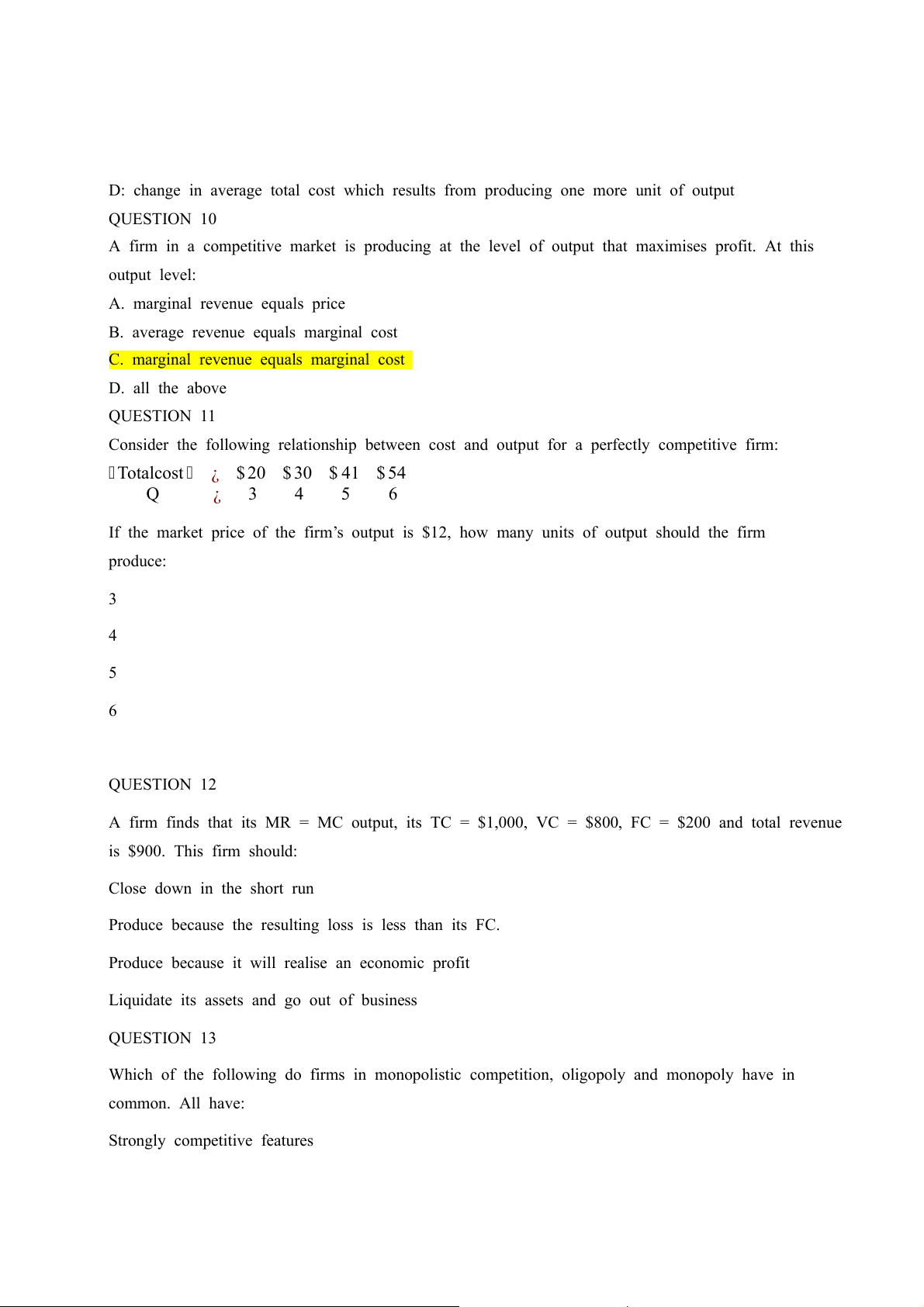 C. marginal revenue equals marginal cost D. all the above QUESTION 11