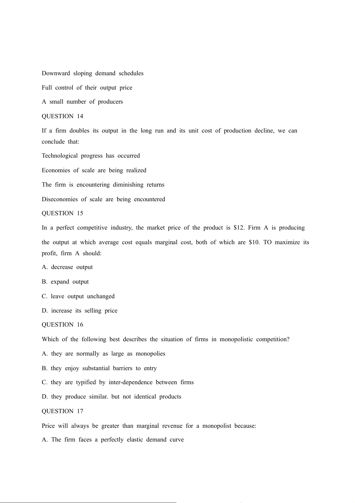 D. The firm must lower price for all units sold in order to increase the quantity sold QUESTION 18