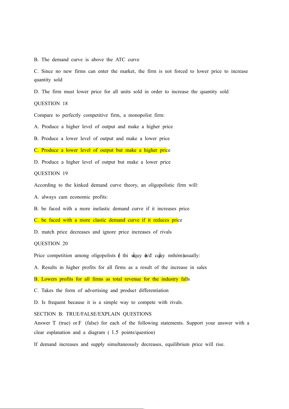 D. Produce a higher level of output but make a lower price QUESTION 19