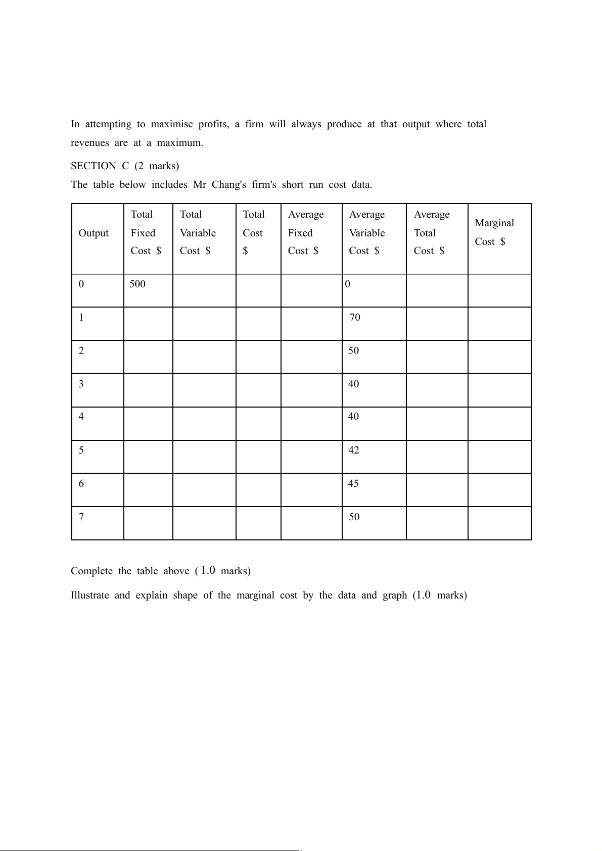 The table below includes Mr Chang's firm's short run cost data. Total Total Total Average Average Average Marginal Output Fixed Variable Cost Fixed Variable Total Cost $ Cost $ Cost $ $ Cost $ Cost $ Cost $ 0 500 0 1 70 2 50 3 40 4 40 5 42 6 45 7 50