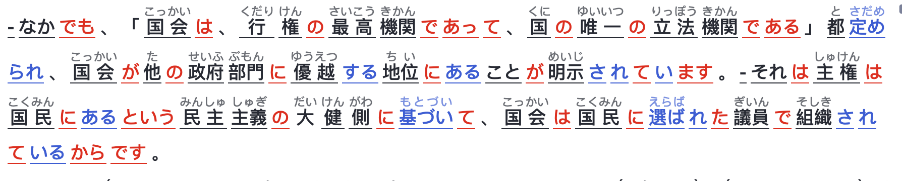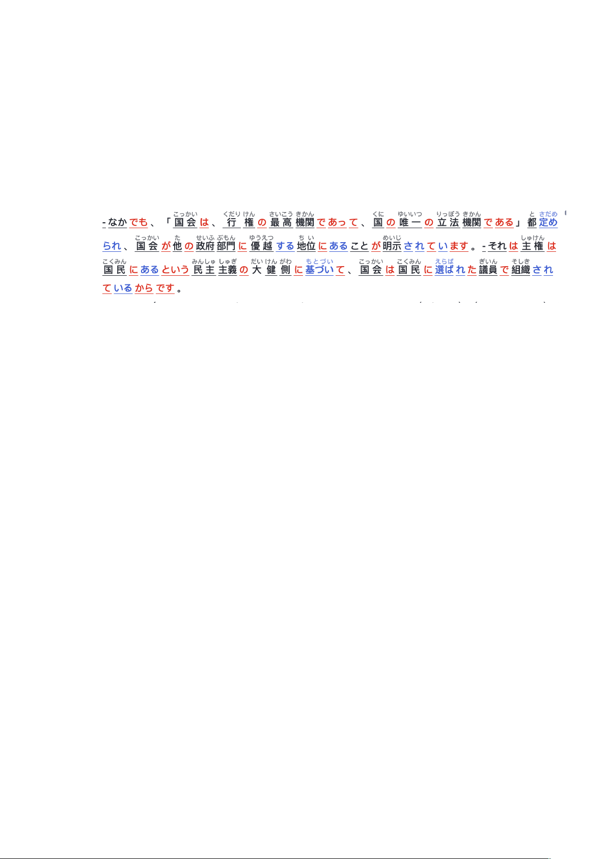 - なかでも、「国会は、行権の最高機関であって、国の唯一の立法機関である」都定められ、国会が他の政府部門に優越する地位にあることが明示されています。