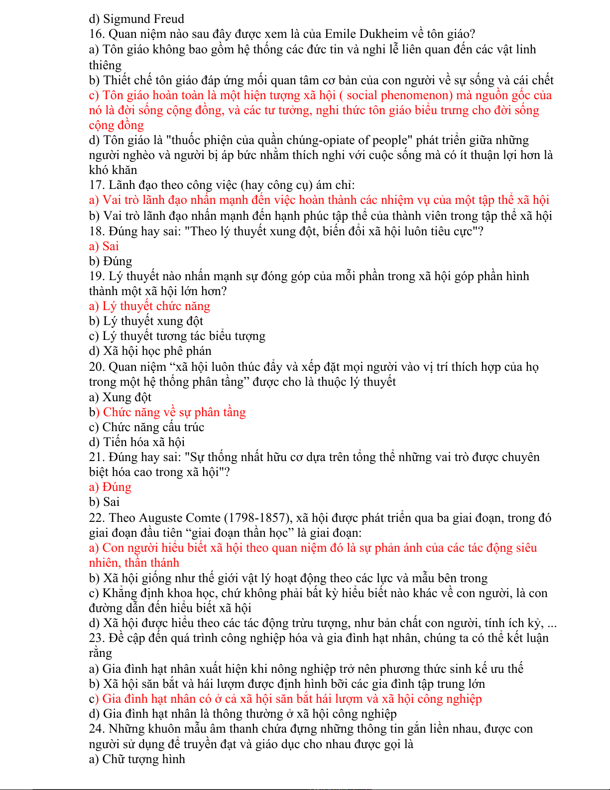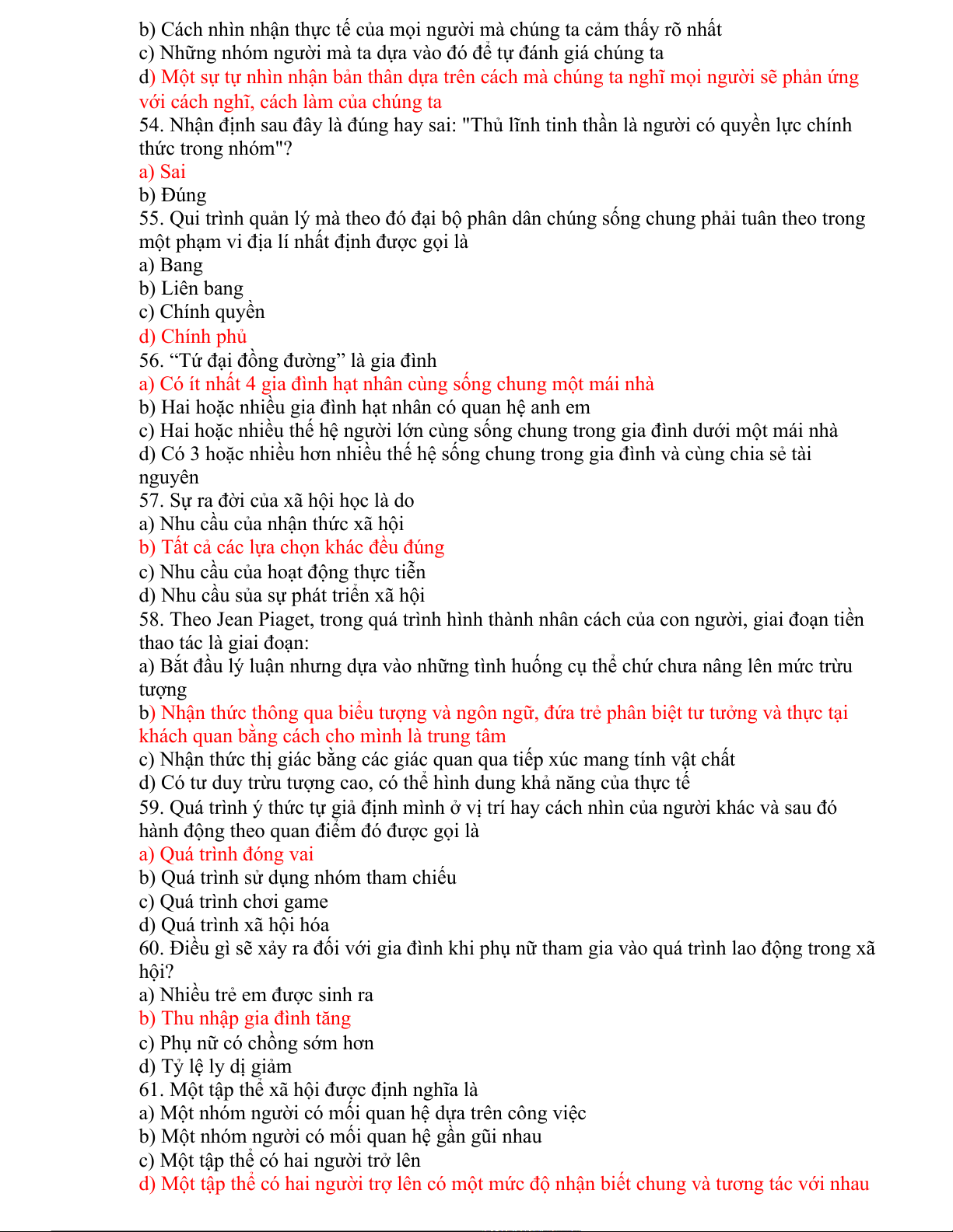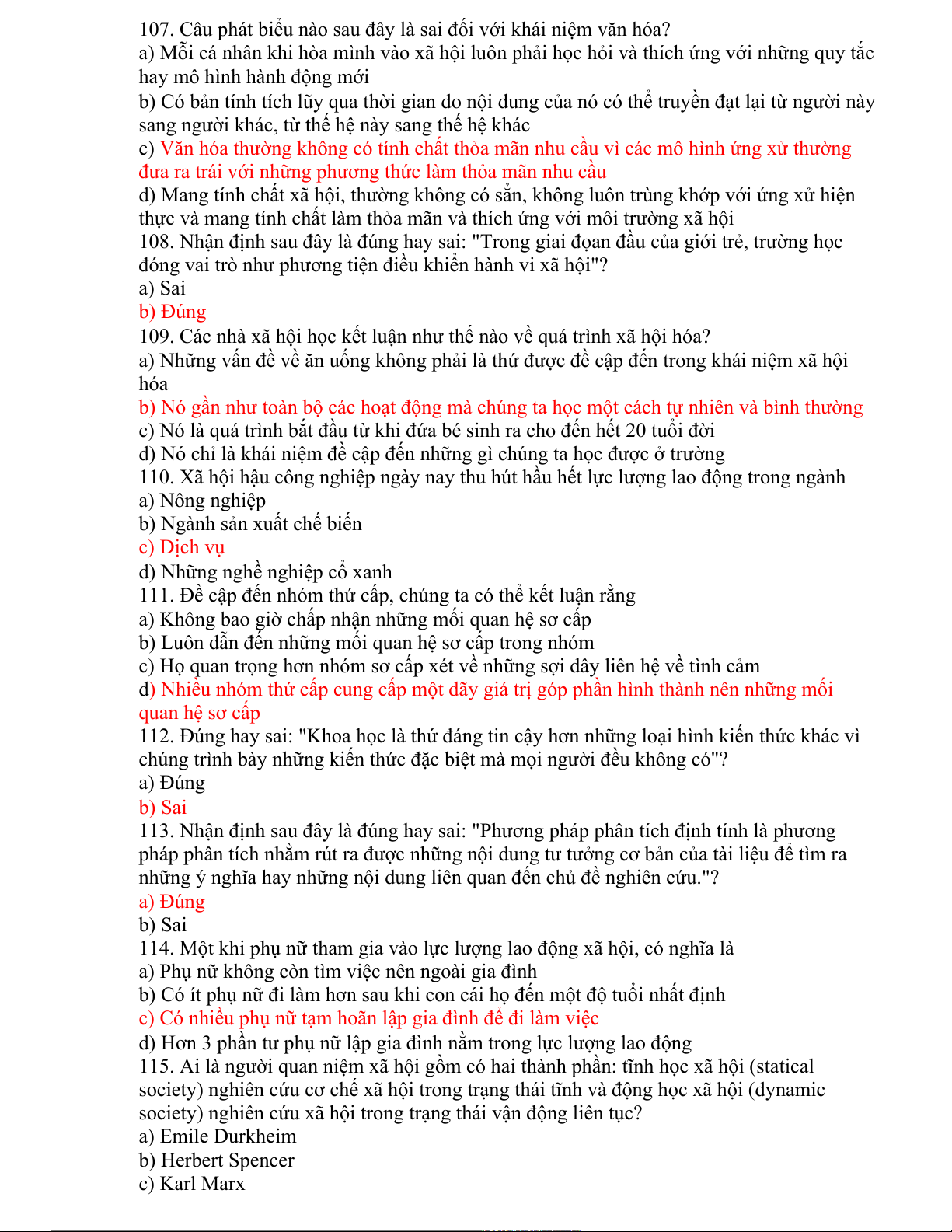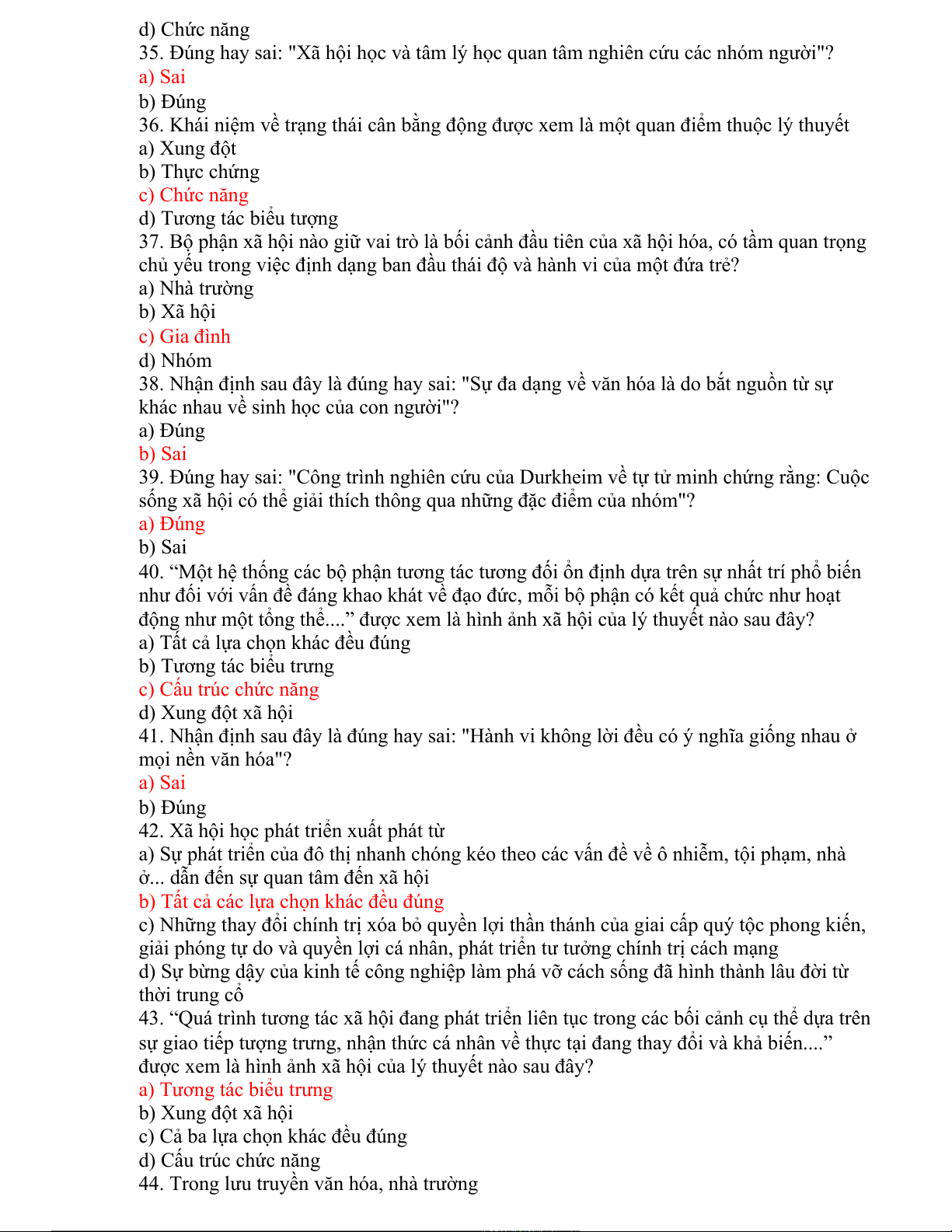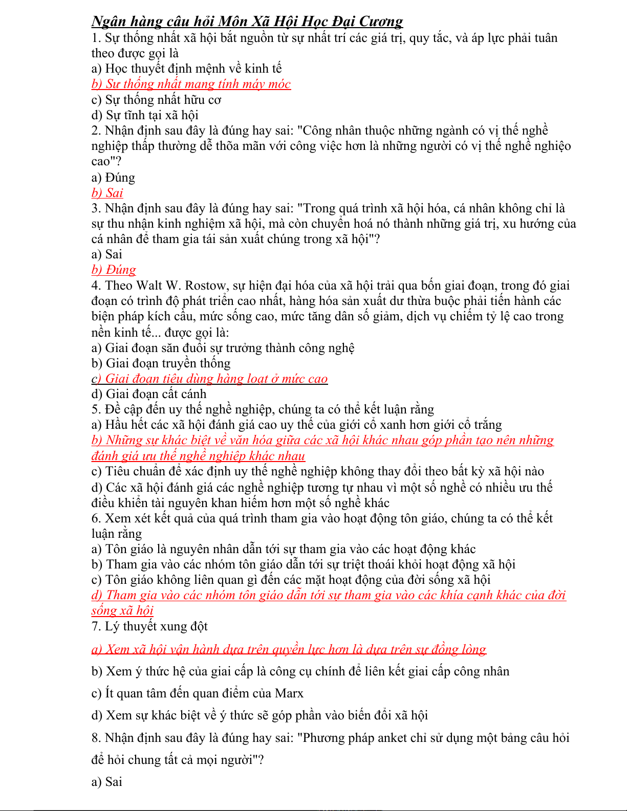 Ngân hàng câu hỏi Môn Xã Hội Học Đại Cương
