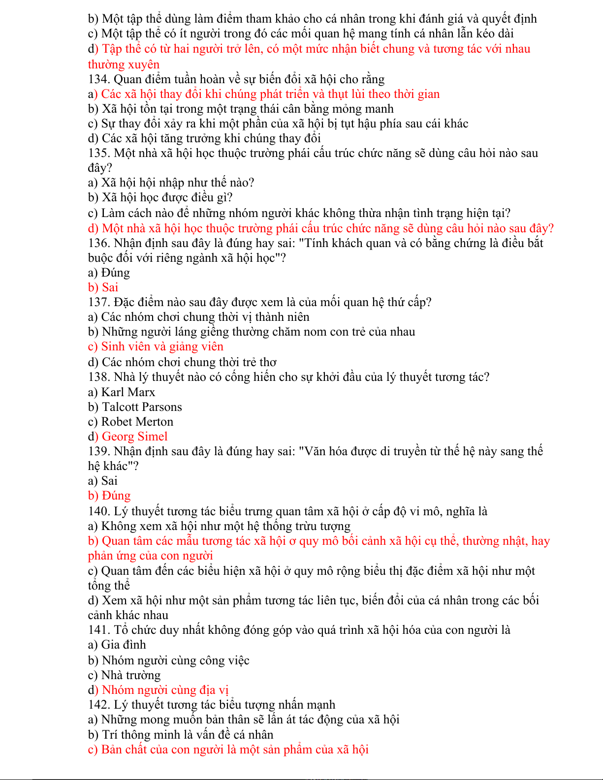 138. Nhà lý thuyết nào có cống hiến cho sự khởi đầu của lý thuyết tương tác? a) Karl Marx b) Talcott Parsons c) Robet Merton d) Georg Simel
