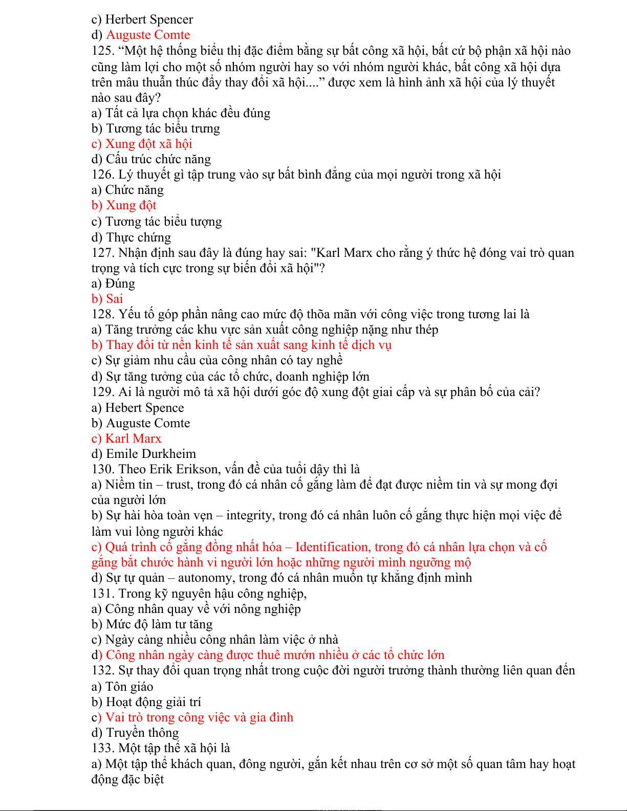 129. Ai là người mô tả xã hội dưới góc độ xung đột giai cấp và sự phân bố của cải? a) Hebert Spence b) Auguste Comte c) Karl Marx d) Emile Durkheim