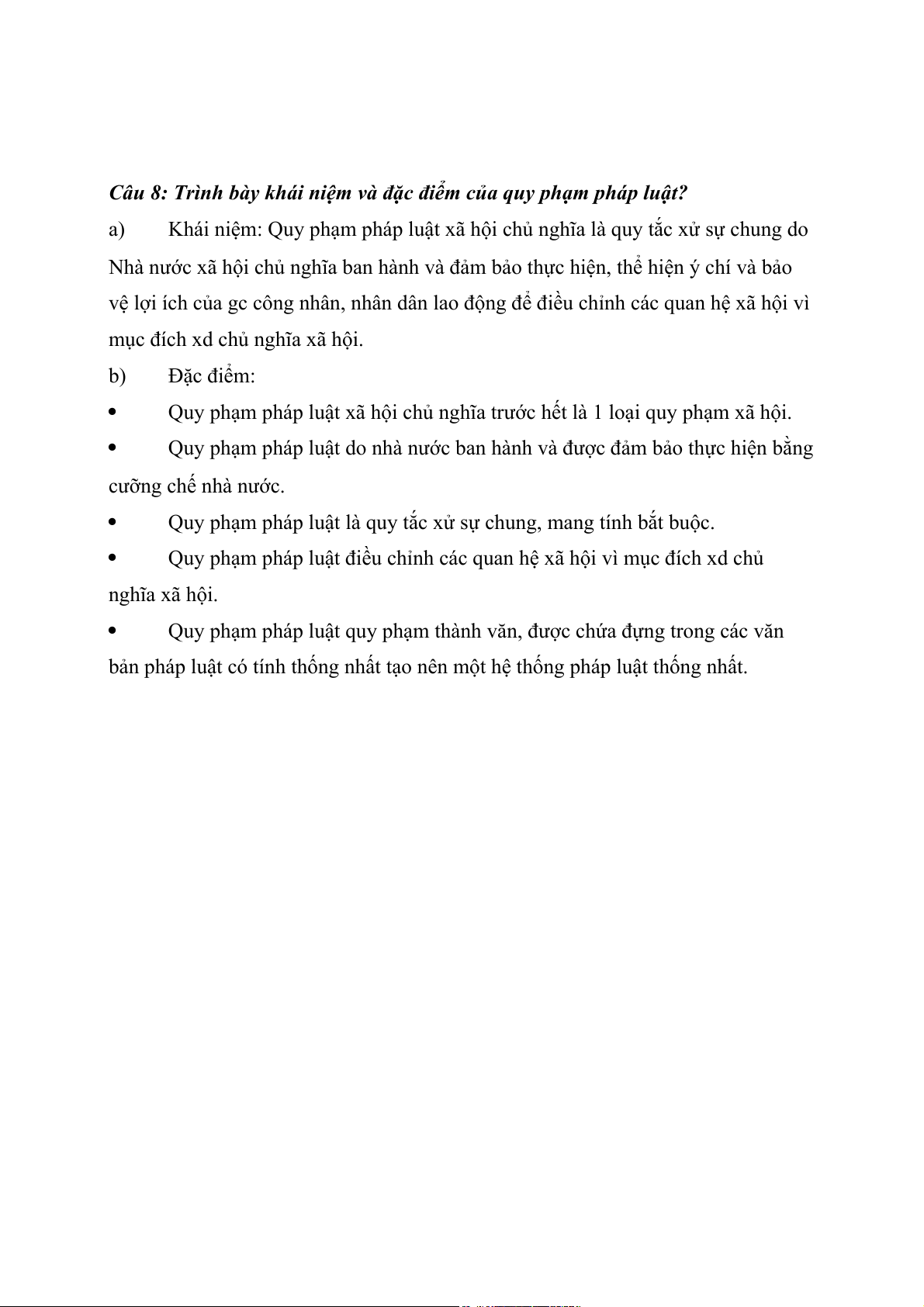Câu 8: Trình bày khái niệm và đặc điểm của quy phạm pháp luật? a)