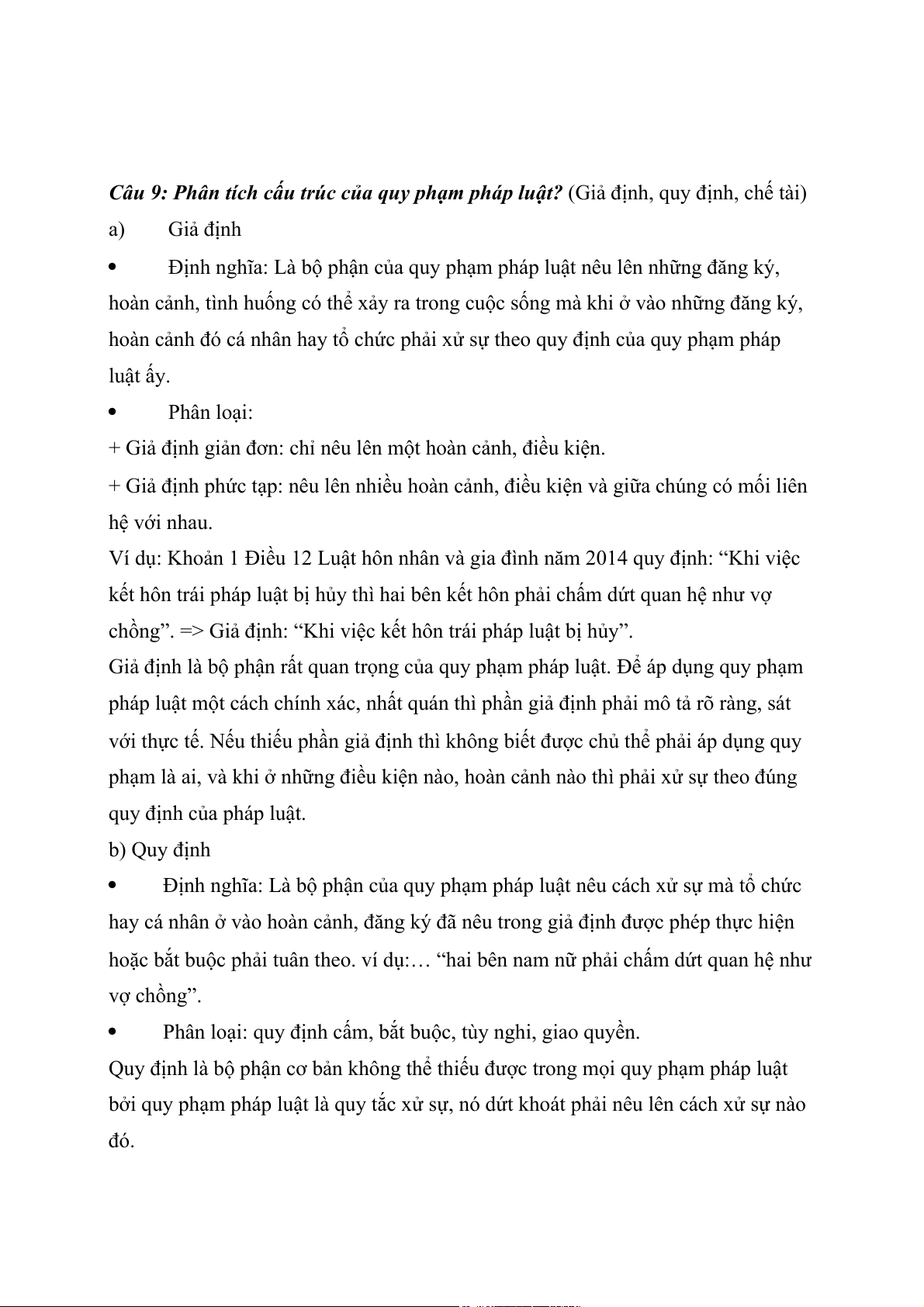 Câu 9: Phân tích cấu trúc của quy phạm pháp luật? (Giả định, quy định, chế tài) a) Giả định