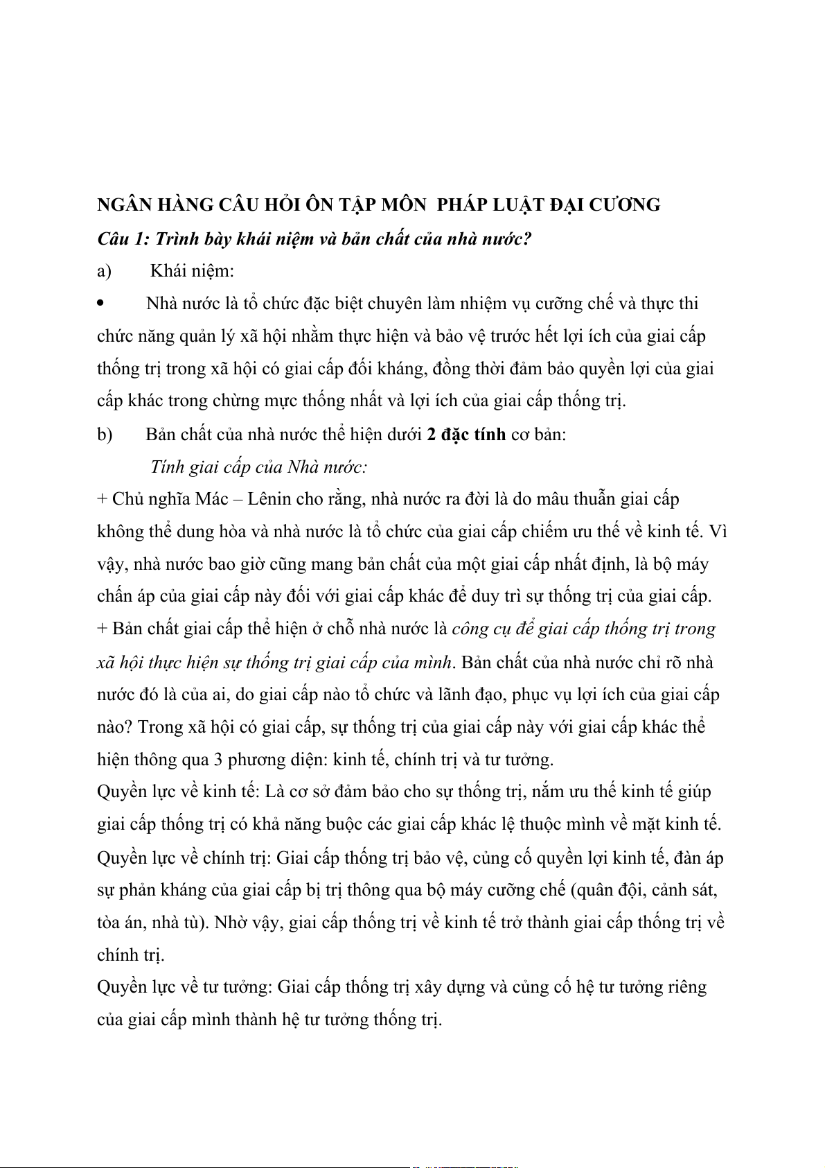 Câu 1: Trình bày khái niệm và bản chất của nhà nước? a) Khái niệm: