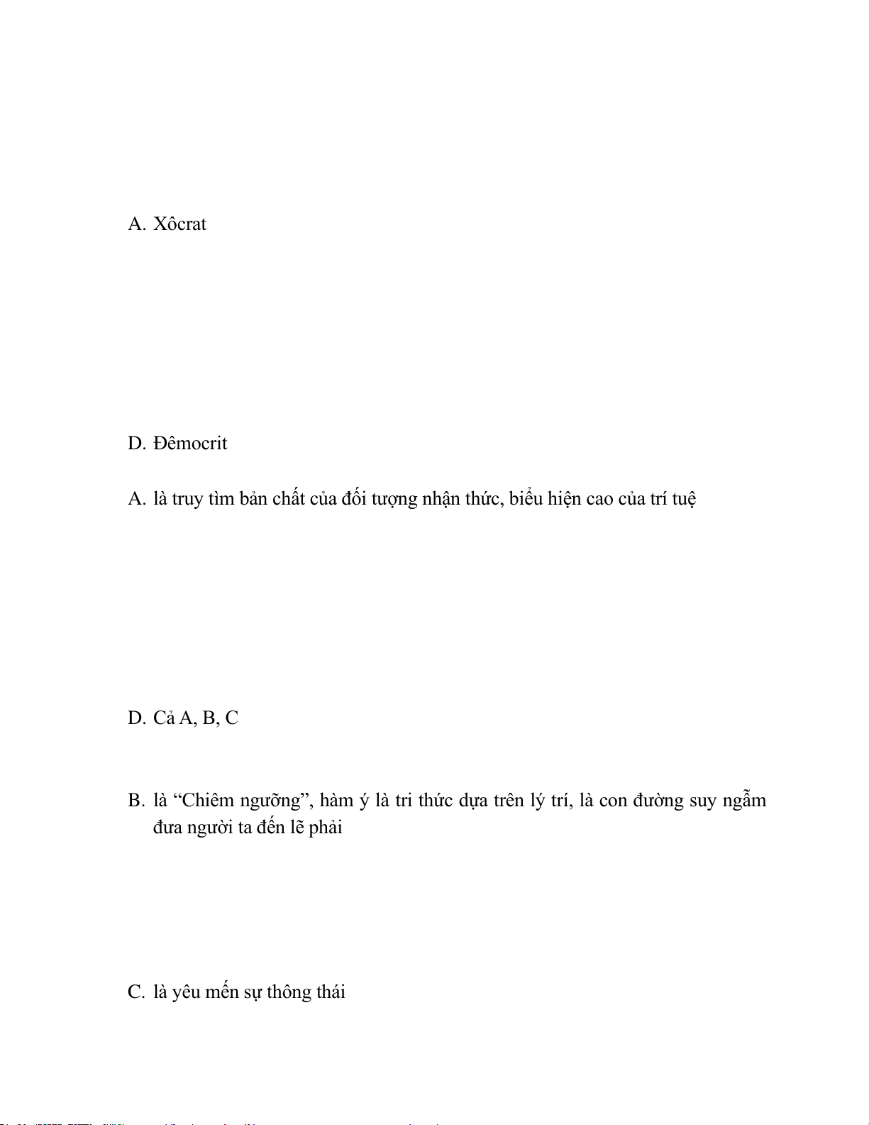 Câu 2: Thuật ngữ “triết gia” được nhà triết học nào sử dụng đầu tiên? A. Hêraclit B. Xôcrat C. Arixtot D. Đêmocrit