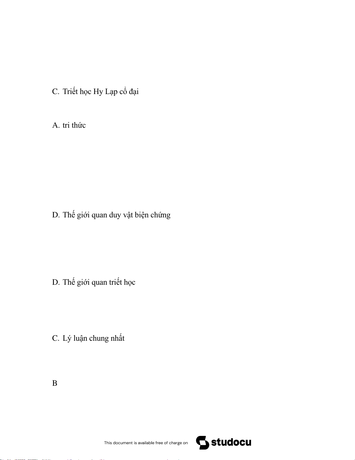 Câu 20: Theo người Hy Lạp cổ đại, triết học với nghĩa là… A. Chiêm ngưỡng B. Lý luận