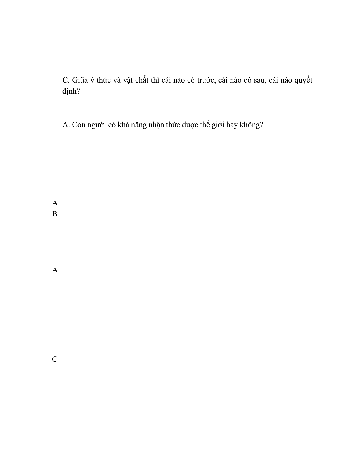 Câu 29: Theo Ph. Ăngghen, vấn đề cơ bản lớn của mọi triết học là: A. Vật chất và ý thức B. Ý thức và vật chất