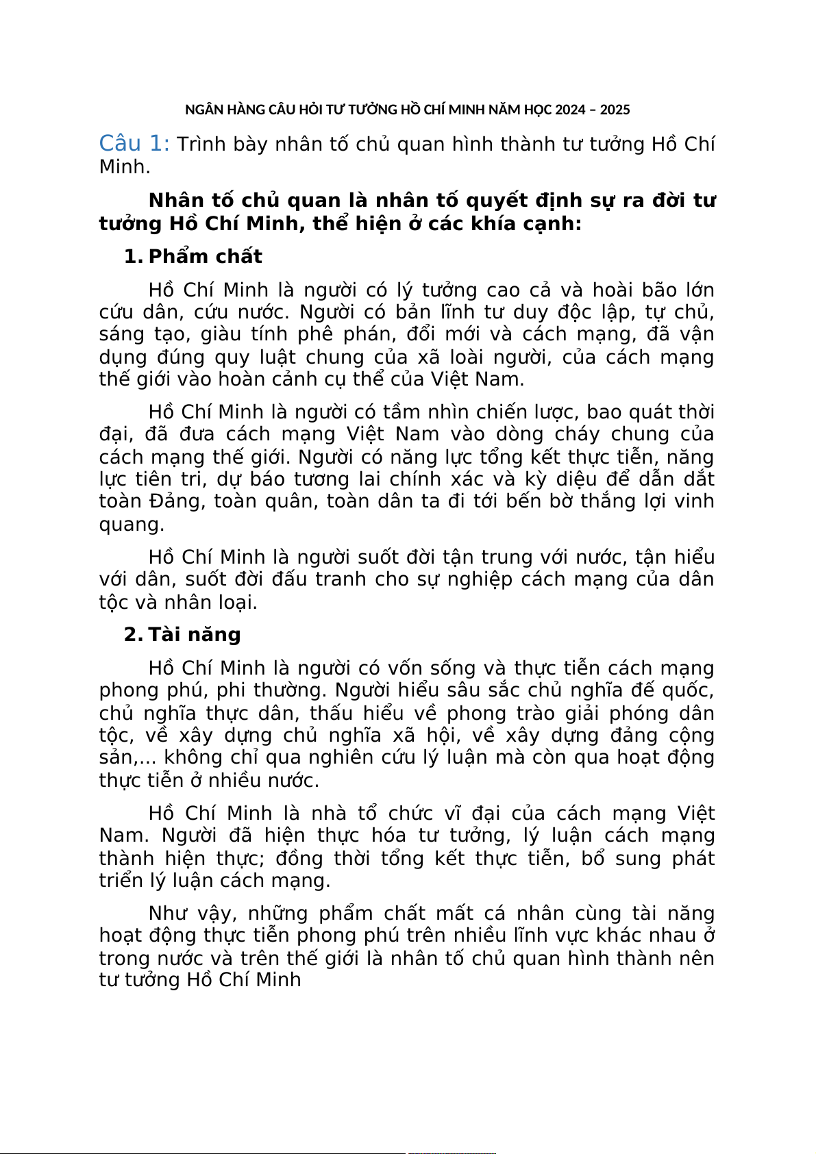 Câu 1: Trình bày nhân tố chủ quan hình thành tư tưởng Hồ Chí Minh.