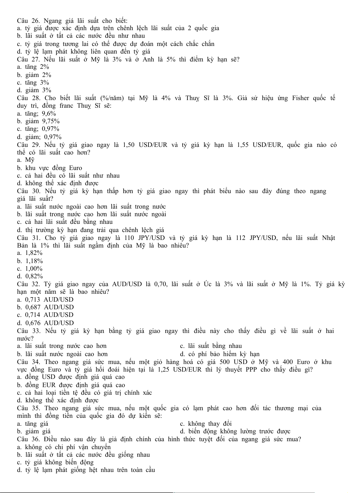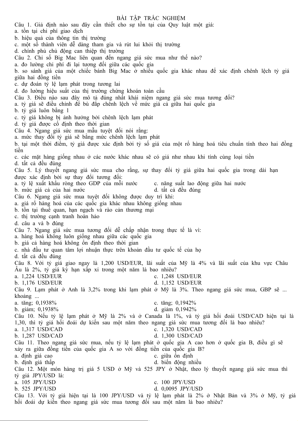 Câu 42. Ngang giá sức mua cho rằng giữa 2 quốc gia tại 2 thời điểm: