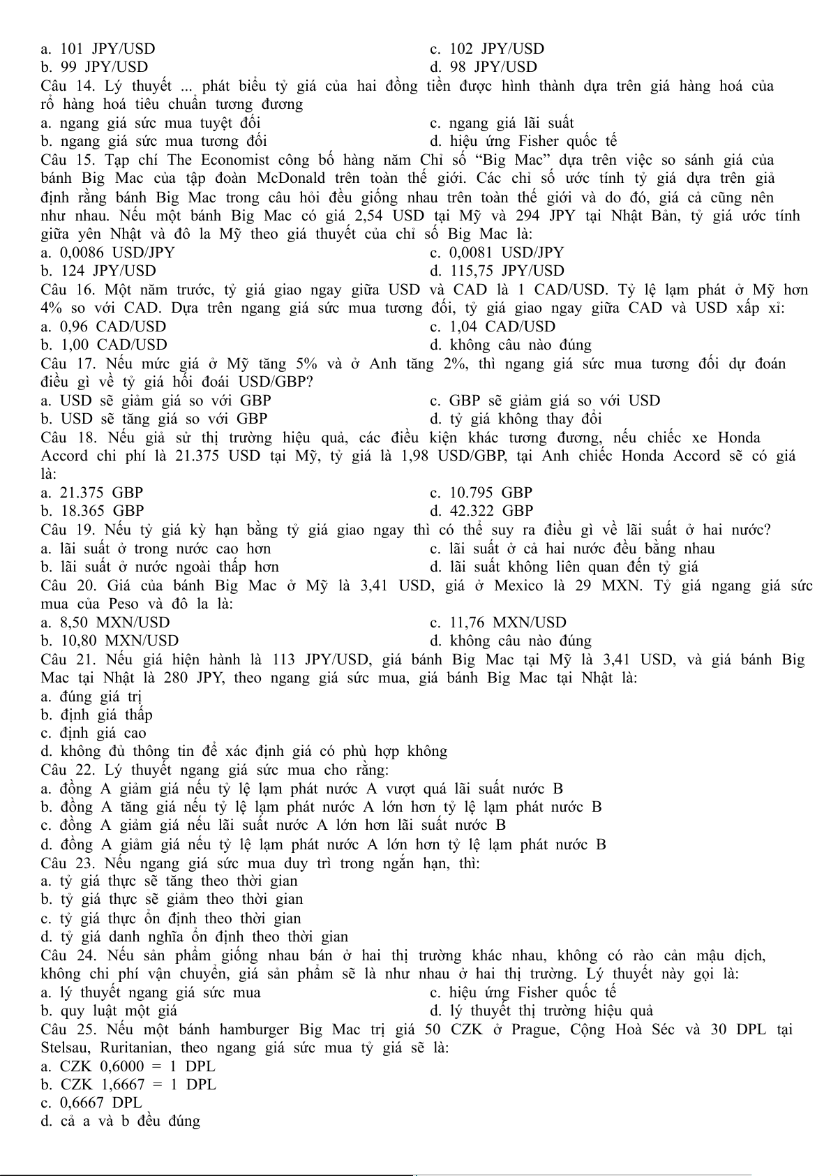Câu 14. Lý thuyết ... phát biểu tỷ giá của hai đồng tiền được hình thành dựa trên giá hàng hoá của