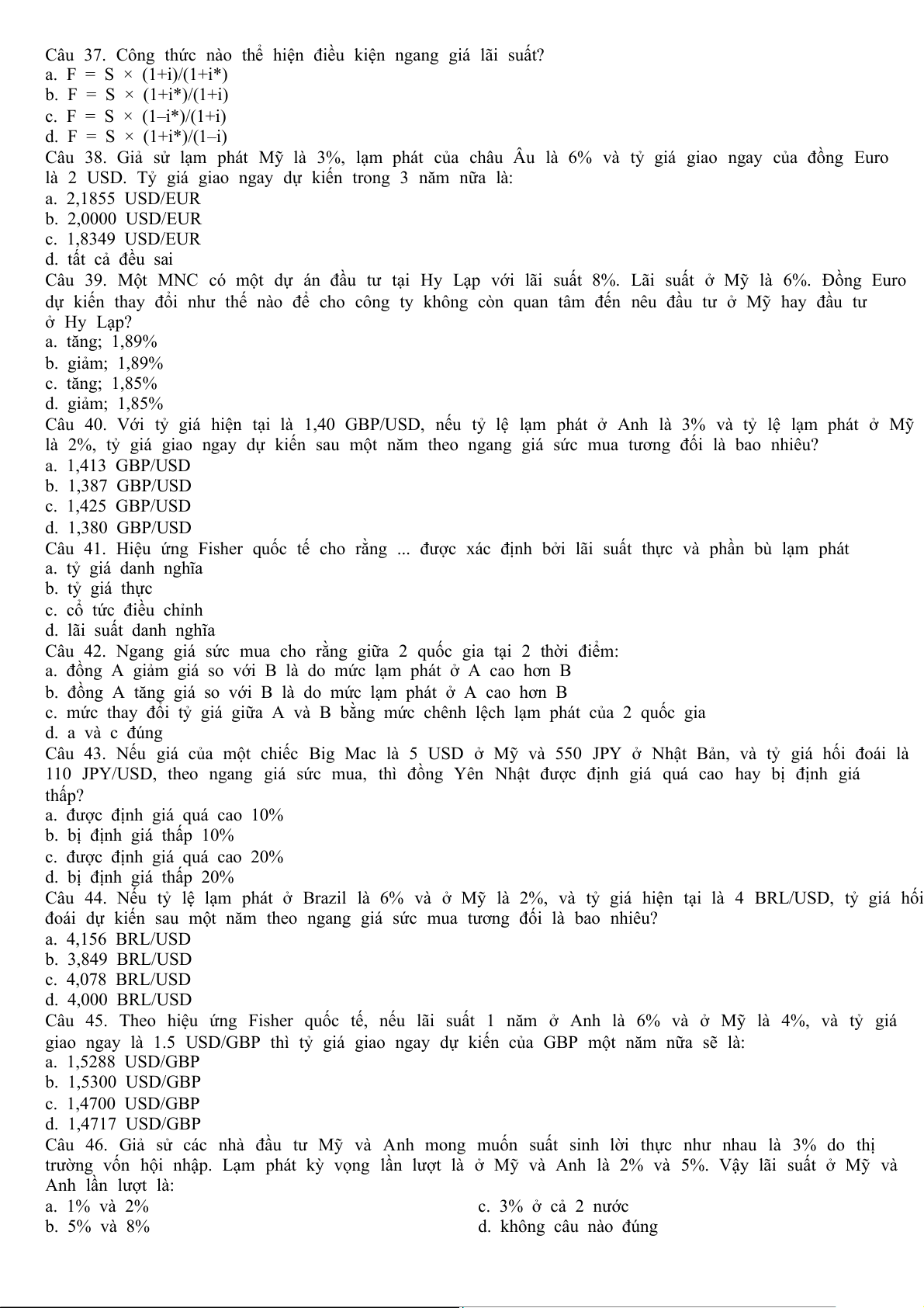 Câu 37. Công thức nào thể hiện điều kiện ngang giá lãi suất? a. F = S × (1+i)/(1+i*) b. F = S × (1+i*)/(1+i) c. F = S × (1–i*)/(1+i) d. F = S × (1+i*)/(1–i)