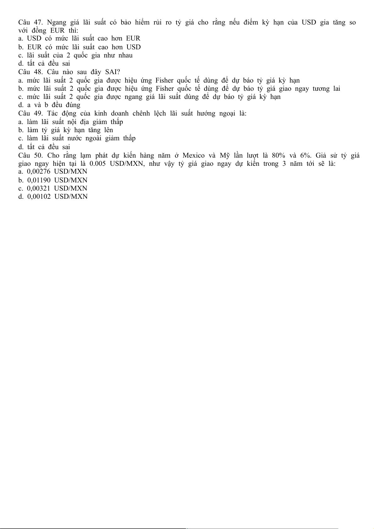 Câu 50. Cho rằng lạm phát dự kiến hàng năm ở Mexico và Mỹ lần lượt là 80% và 6%. Giả sử tỷ giá