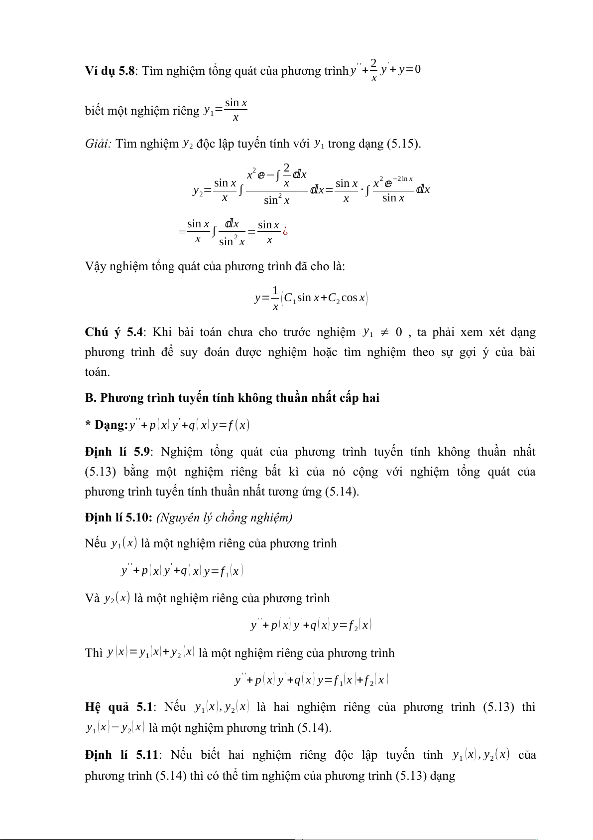 Giải: Tìm nghiệm y độc lập tuyến tính với y trong dạng (5.15). 2 1 2 x2 ⅇ−∫ ⅆx sin x x sin x x2 ⅇ−2ln x y = ∫ ⅆx= ⋅ ∫ ⅆx 2 x 2 sin x x sin x sin x ⅆx sin = x ∫ = ¿ x 2 sin x x