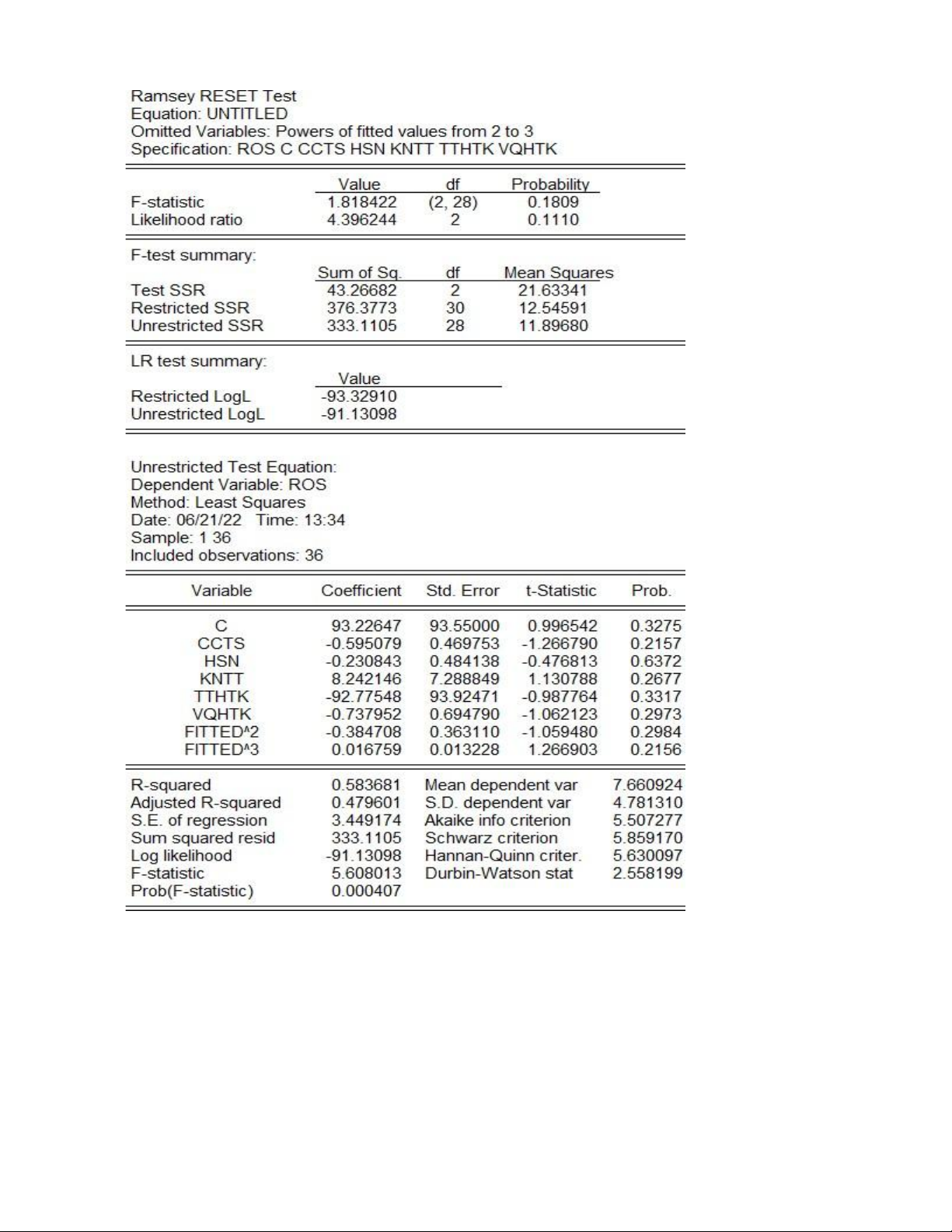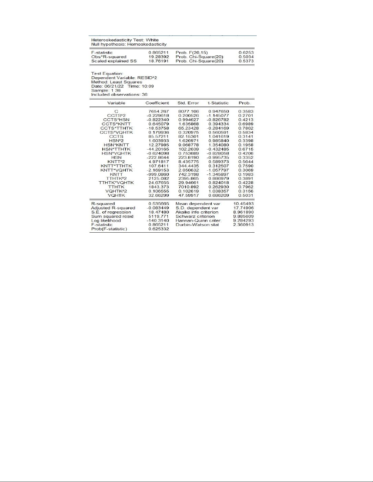 31.02866).TTHTK + (-0.237931).VQHTK Included observations: 36 Variable Coefficient Std. Error t-Statistic Prob. C 29.67228 25.02288 1.185806 0.2450 CCTS -0.156299 0.13294 -1.183236 0.2460 HSN -0.073255 0.334285 -0.219138 0.8280 KNTT 2,406982 0.698475 3.446054 0.0017 TTHTK -31.02866 16.27378 -1.906666 0.0662 VQHTK -0.237931 0.085842 -2.771730 0.0095 R-squared 0.0529606 Mean depend ent var 7.660924 Adjusted S.D. dependent Rsquared 0.451207 var 4.781310 S.E. of Akaike info regression 3.542021 criterion 5.518284 Sum squared Schwarz resid 376.3773 criterion 5.782203 Log likelihood -93.32910 Hannan-Quinn criter. 5.610399 F-statistic 6.755271 Durbin-Watson stat 2.408716 Prob(F-statistic) 0.000252
