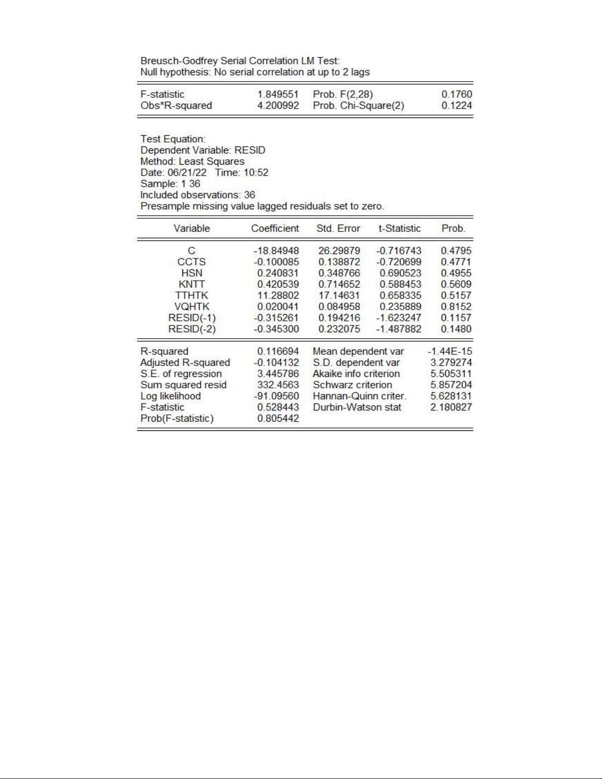 Vậy: Chấp nhận H0, Bác bỏ H1. Tức là: Mô hình không có tự tương quan bậc 2.