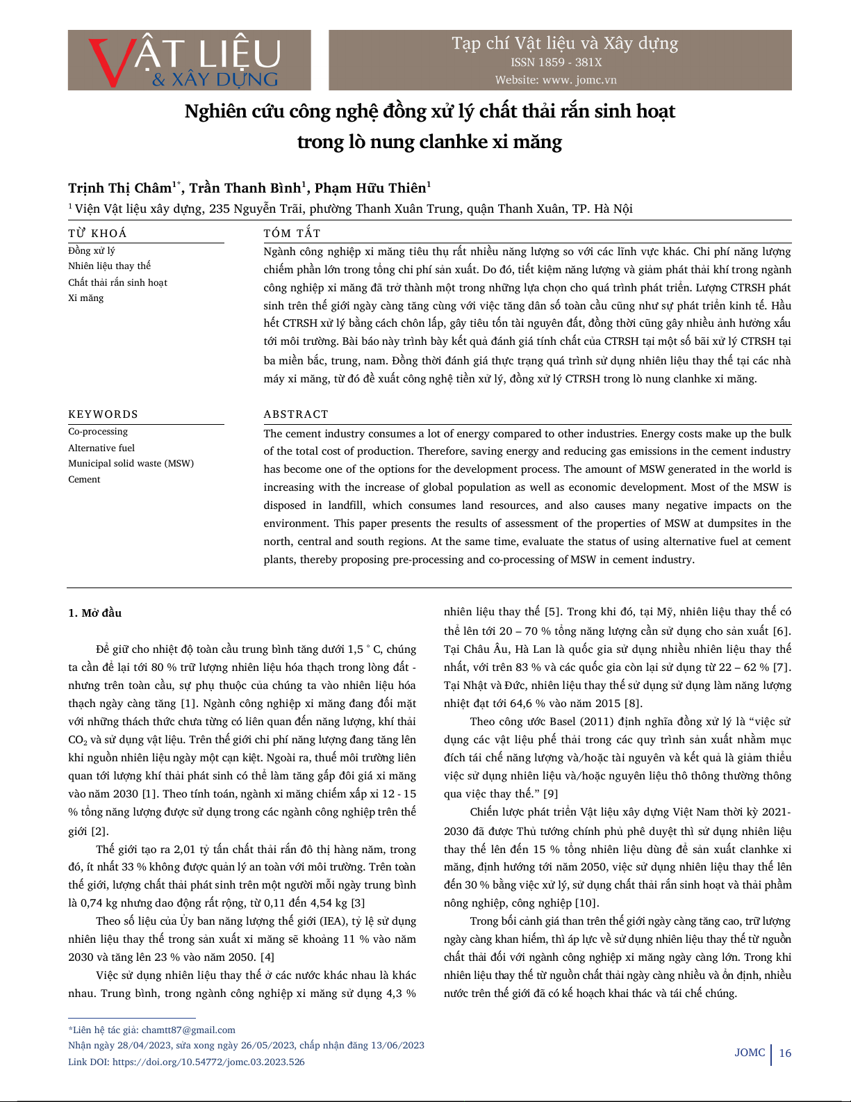máy xi măng, từ đó đề xuất công nghệ tiền xử lý, đồng xử lý CTRSH trong lò nung clanhke xi măng. K E Y W O R D S A B S T R A C T Co-processing