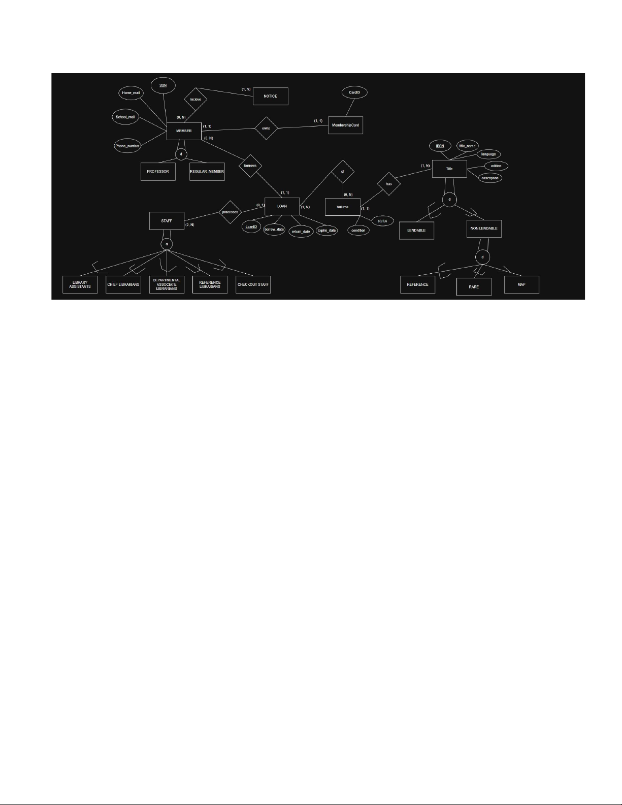 • Member – Loan (borrows): Member (1,N) ↔ Loan (1,1).