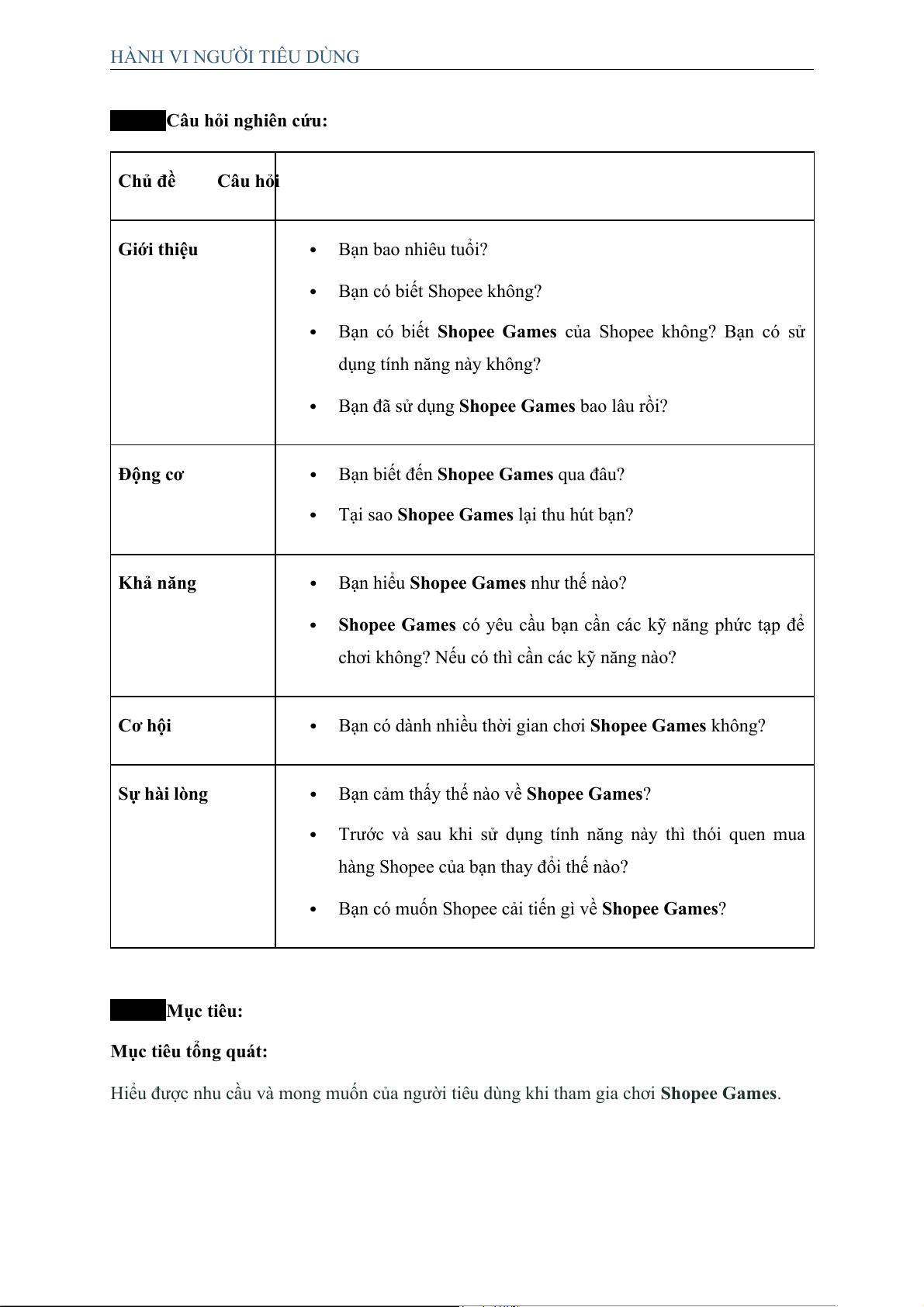 Hiểu được nhu cầu và mong muốn của người tiêu dùng khi tham gia chơi Shopee Games. HÀNH VI NGƯỜI TIÊU DÙNG Mục tiêu cụ thể: