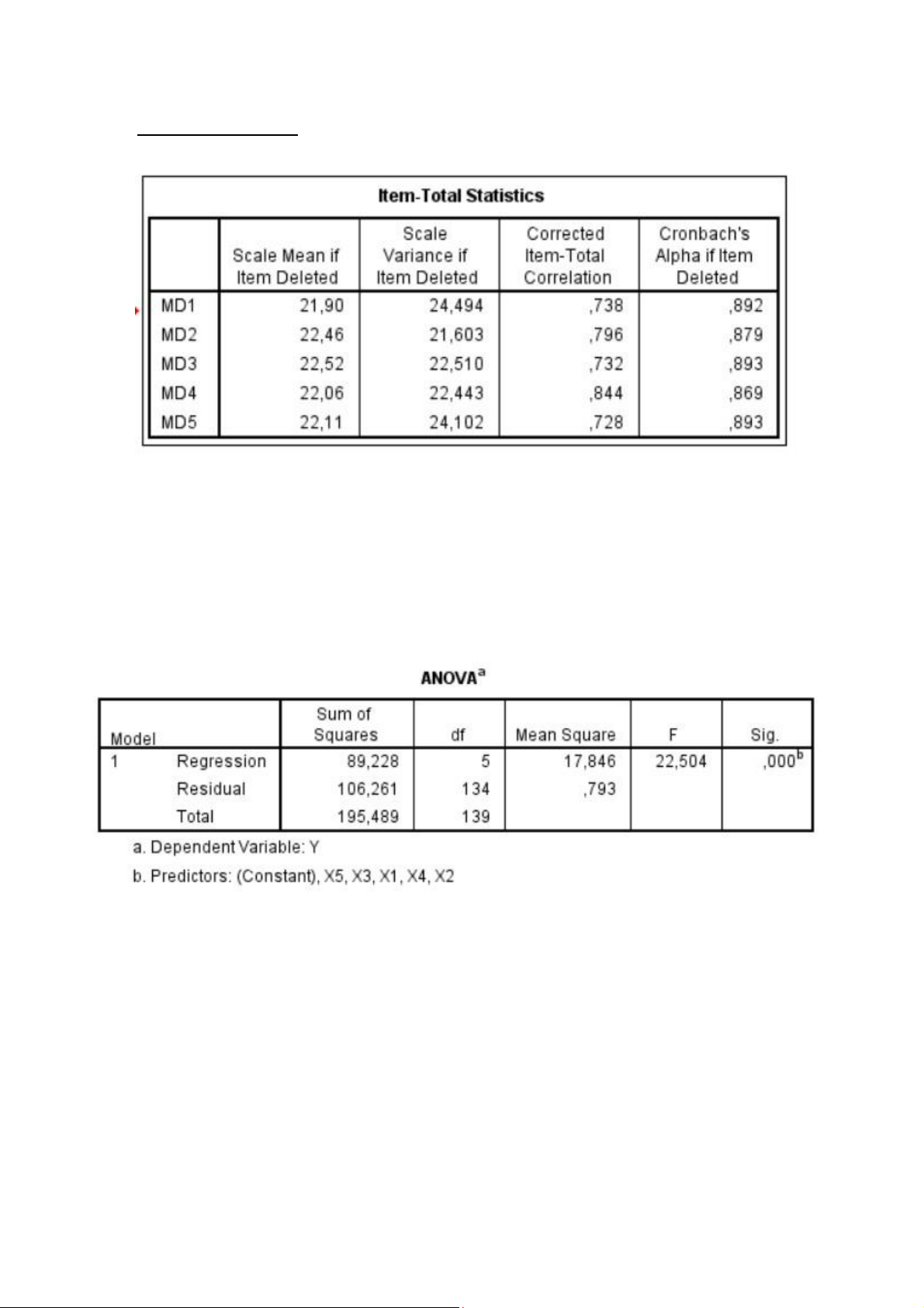 Các biến đều có hệ số tương quan biến-tổng > 0.3 -> không loại bỏ biến 4. Hồi quy bội a) Anova Giả thiết :