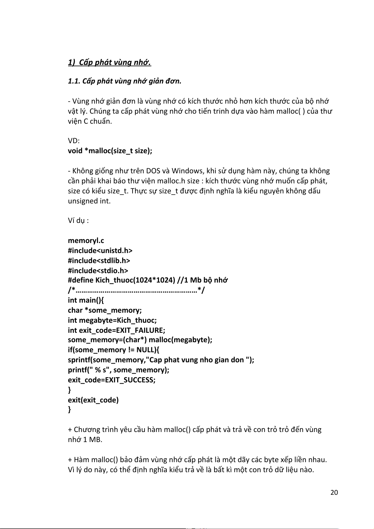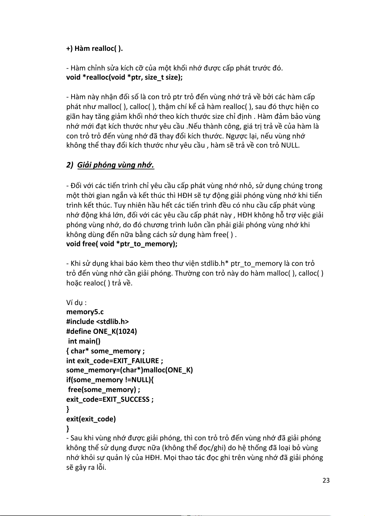 trỏ đến vùng nhớ cần giải phóng. Thường con trỏ này do hàm malloc( ), calloc( ) hoặc realoc( ) trả về. Ví dụ : memory5.c #include #define ONE_K(1024) int main() { char* some_memory ; int exit_code=EXIT_FAILURE ;