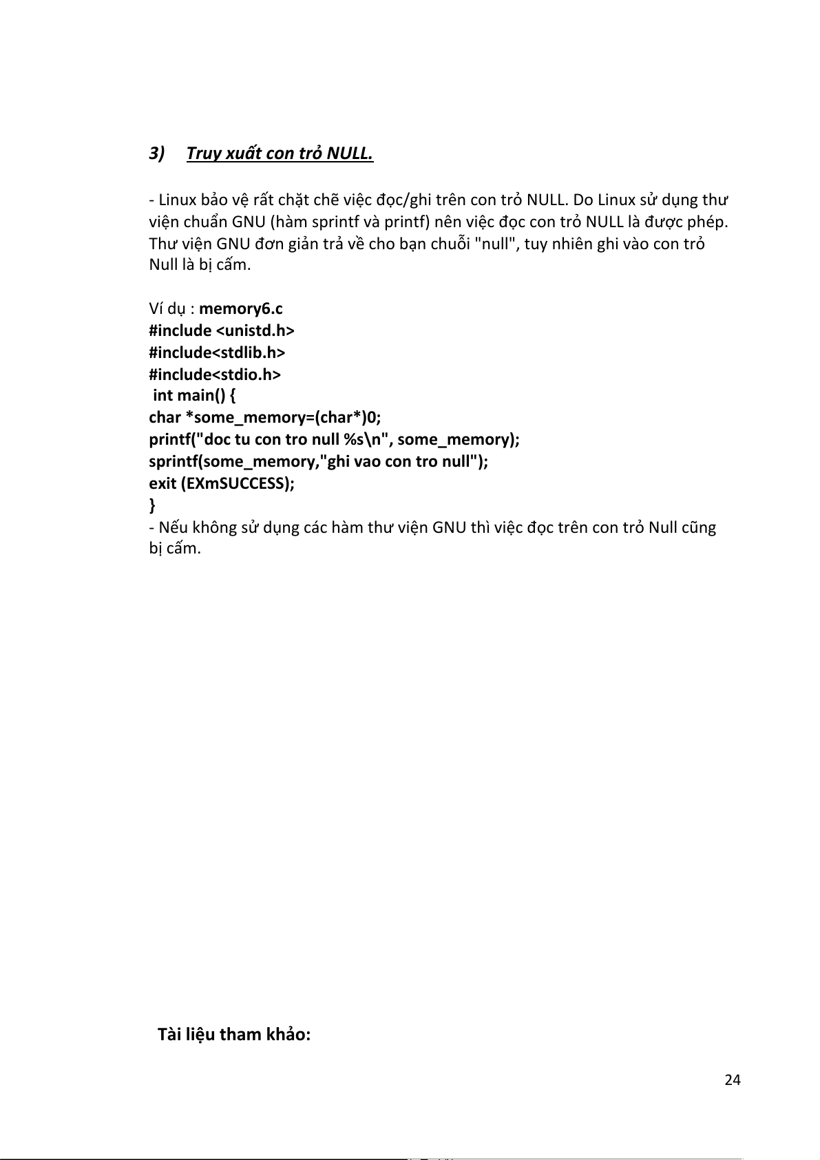Thư viện GNU đơn giản trả về cho bạn chuỗi "null", tuy nhiên ghi vào con trỏ Null là bị cấm. Ví dụ : memory6.c #include #include #include int main() { char *some_memory=(char*)0;