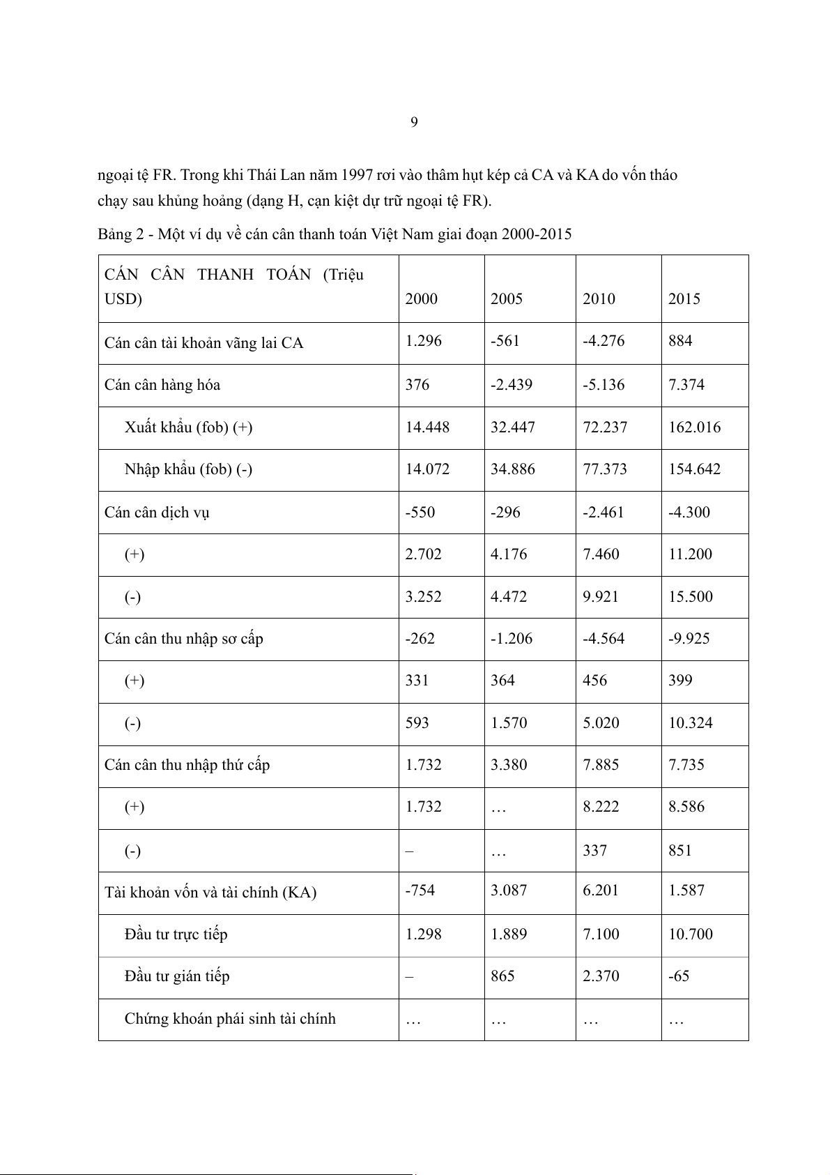Bảng 2 - Một ví dụ về cán cân thanh toán Việt Nam giai đoạn 2000-2015