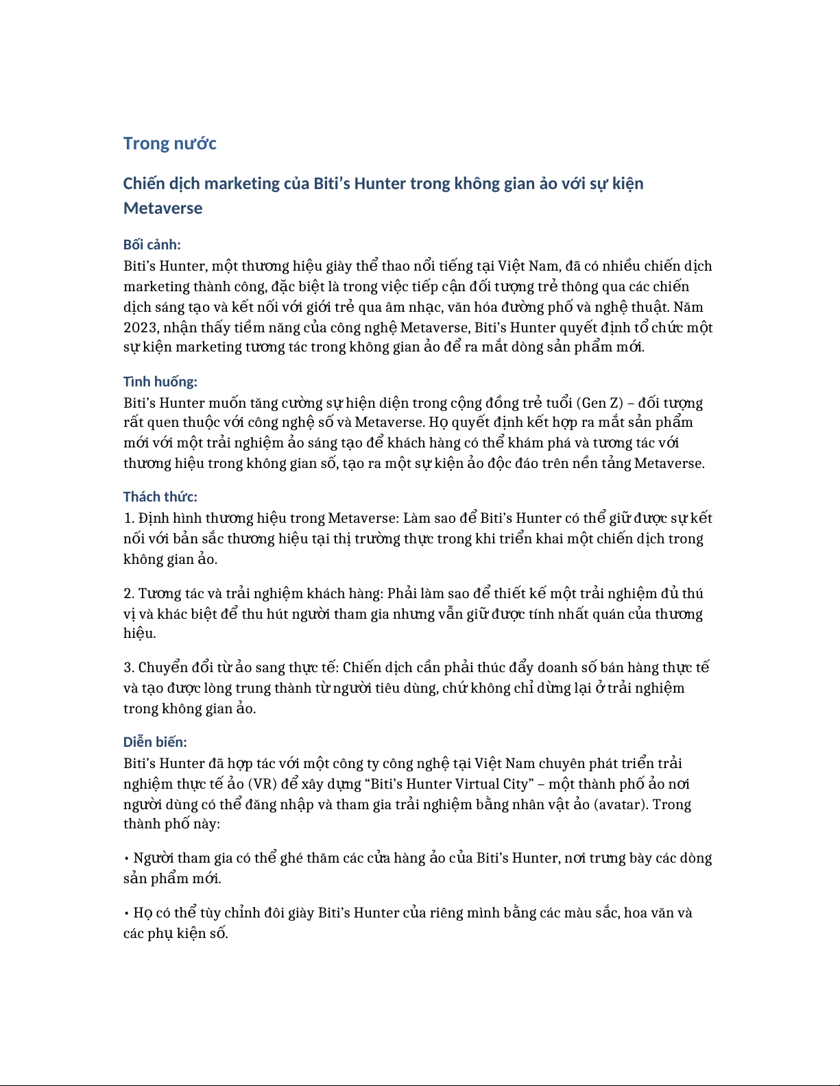 ươ g tác trong không gian o ả đ ể ra m t ắ dòng s n ả ph m ẩ m i ớ . Tình huống: Biti’s Hunter mu n ố tăng c n ườ g s ự hi n ệ di n ệ trong c n ộ g đ n ồ g trẻ tu i ổ (Gen Z) – đ i ố t n ượ g r t ấ quen thu c ộ v i ớ công ngh ệ s ố và Metaverse. H ọ quy t ế đ n ị h k t ế h p ợ ra m t ắ s n ả ph m ẩ m i ớ v i ớ m t ộ tr i ả nghi m ệ o ả sáng t o ạ để khách hàng có th ể khám phá và t n ươ g tác v i ớ th n
