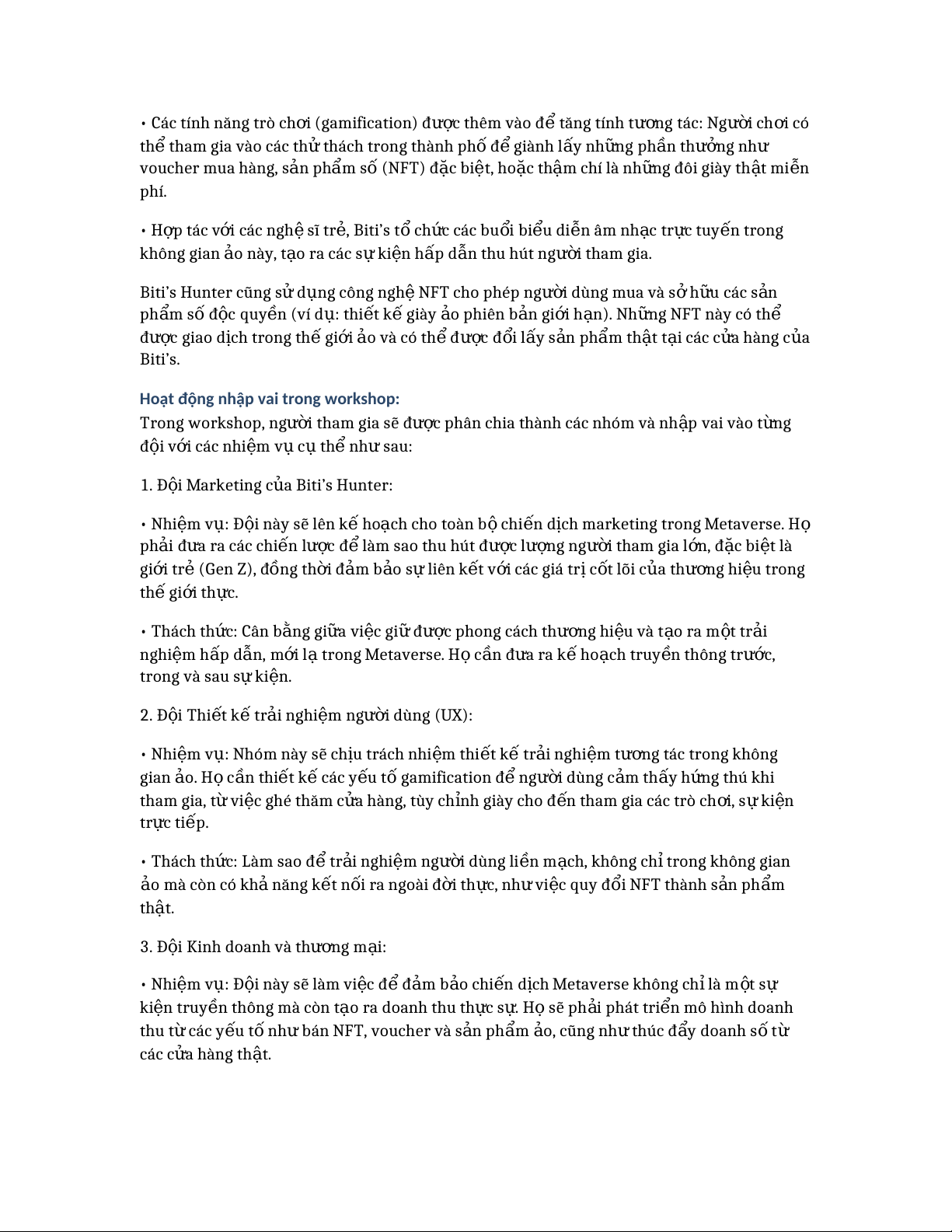 ị h marketing trong Metaverse. Họ ph i ả đ a ư ra các chi n ế l c ượ đ ể làm sao thu hút đ c ượ l n ượ g ng i ườ tham gia l n ớ , đ c ặ bi t ệ là gi i ớ tr ẻ (Gen Z), đồng th i ờ đ m ả b o ả sự liên k t ế v i ớ các giá tr ịc t ố lõi c a ủ th n ươ g hi u ệ trong th ế gi i ớ th c ự . • Thách th c ứ : Cân bằng gi a ữ vi c ệ gi ữ đ c ượ phong cách th n ươ g hi u ệ và t o ạ ra m t ộ tr i ả nghi m ệ h p ấ d n ẫ , m i ớ lạ trong Metaverse. H ọ c n ầ đ a ư ra k ế ho c ạ h truy n ề thông tr c ướ , trong và sau s ự ki n ệ . 2. Đ i ộ Thi t ế k ế trải nghi m ệ ng i ườ dùng (UX): • Nhi m ệ v : ụ Nhóm này sẽ ch u ị trách nhi m ệ thi t ế kế tr i ả nghi m ệ t n ươ g tác trong không gian o ả . H ọ c n ầ thi t ế k ế các y u ế t ố gamification đ ể ng i ườ dùng c m ả th y ấ h n ứ g thú khi tham gia, t ừ vi c ệ ghé thăm c a ử hàng, tùy ch n ỉ h giày cho đ n ế tham gia các trò ch i ơ , s ự ki n ệ tr c ự tiếp. • Thách th c ứ : Làm sao đ ể tr i ả nghi m ệ ng i ườ dùng li n ề m c