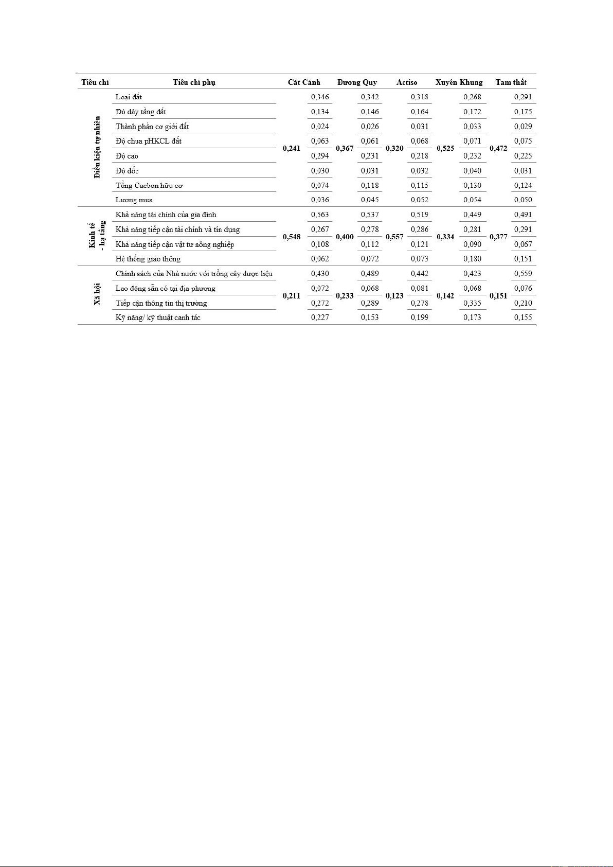 (gồm 16 yếu tố/tiêu chí phụ) tới sự phát triển cây dược liệu. Đối với mỗi cây dược